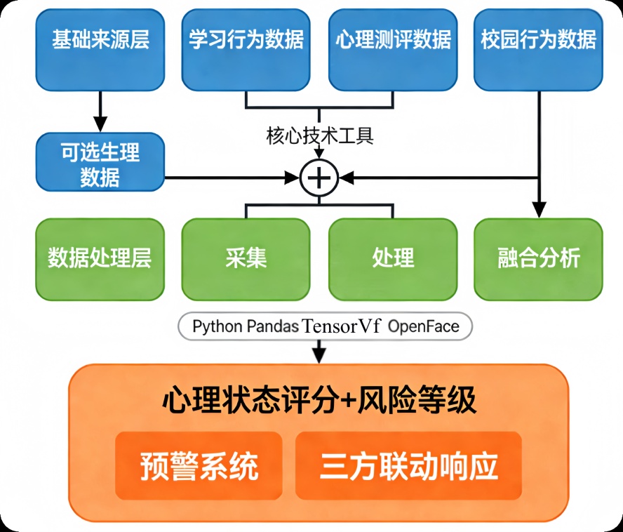 基础数据:学籍信息、年级专业、生源地等。学习行为数据:学习平台(超星、雨课堂等)的登录频率、学习时长、作业完成情况、互动讨论文本等。心理测评数据:SCL-90、SAS、SDS等标准化量表测评结果。校园行为数据:门禁刷卡记录(作息规律分析)、校园消费数据(生活状态判断)、图书馆借阅记录(兴趣偏好挖掘)。可选生理数据:自愿佩戴智能手环采集的心率、睡眠质量数据等。社交互动数据:匿名化处理的班级群、社团群互动频率。