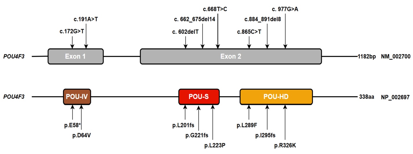 Bai, X., Zhang, F., Xiao, Y., Jin, Y., Zheng, Q., Wang, H., et al. (2020) Identification of Two Novel Mutations in POU4F3 Gene Associated with Autosomal Dominant Hearing Loss in Chinese Families. Journal of Cellular and Molecular Medicine, 24, 6978-6987. [Google Scholar] [CrossRef] [PubMed]
