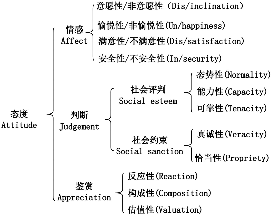 语言不仅是信息传递的工具,更是态度与立场投射的重要载体。说话主体通过语言表达情感、判断与价值取向,并在与受话者的互动中实现意义协商与立场认同,体现了系统功能语言学所强调的人际功能[2]。其中,评价系统通过聚焦语篇的语义层面,揭示了说话者态度的类型、来源与强度,并展现了人际意义在语篇生成中的社会性[3]。
