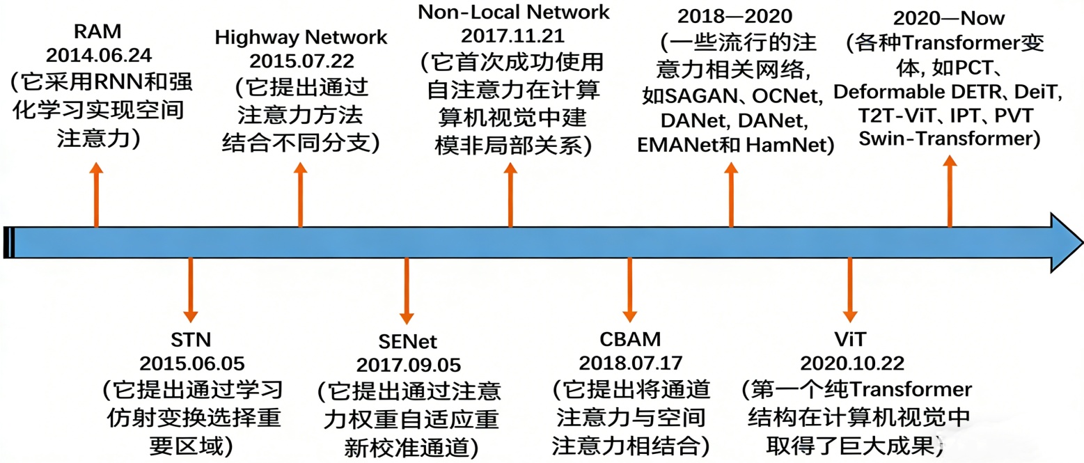 图中显示在最初探索阶段(2014~2015),研究者通过Recurrent Attention Model (RAM)模型的强化学习实现空间定位,以及空间变换网络(Spatial Transformer Network, STN)学习仿射变换来校正图像区域,这些工作奠定了注意力机制的雏形。其次,2017年成为关键转折点:挤压激励网络(Squeeze-and-Excitation Network, SENet)提出的通道注意力机制通过特征重校准显著提升了网络表达能力,而非局部网络(non-local network)这一事件首次将自注意力成功引入视觉领域,突破了传统卷积的局部感受野限制。在随后的发展时期(2018~2020),研究者开始系统整合不同维度的注意力机制,如卷积块注意力模块(Convolutional Block Attention Module, CBAM)将通道与空间注意力有机结合,同时涌现出多种注意力网络的创新设计。2020年之后,视觉转换器(Vision Transformer, VT)的突破性成果引领了研究范式的转变,证明完全基于自注意力的架构在视觉任务中的卓越性能,继而催生了众多适应不同视觉任务的Transformer变体推动注意力机制成为计算机视觉的核心建模工具。这一演进过程不仅体现了对特征制度的持续深化,更体现着视觉表征学习范式的变革。