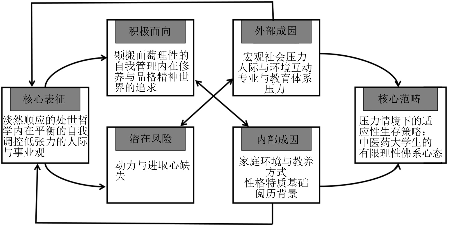 在当前社会高速发展与竞争日益激烈的背景下,“佛系”作为一种青年亚文化心态与生活方式,在大学生群体中引起了广泛关注与讨论。佛系心态通常表现为一种顺其自然、不争不抢、随遇而安、看淡得失的处世哲学(戴仁卿,杨殿闯,2018;董振华,2019)。目前,相关研究多集中于文学(陈旭光,宋奇勋,2019)、思想政治教育(吴朝进,张金荣,2021)和组织管理(晏渝等,2024)等领域,研究对象以青年大学生(徐美华,刘轩,2022)和青年职工(晏渝等,2024)为主,尚未聚焦于中医药大学生这一特定群体。中医药学秉承“中庸平和”“阴阳平衡”“道法自然”等哲学思想,与佛系心态在文化内核上存在深度的同源性。受专业理念熏陶,中医药大学生可能对佛系心态具有独特的理解与体验。
