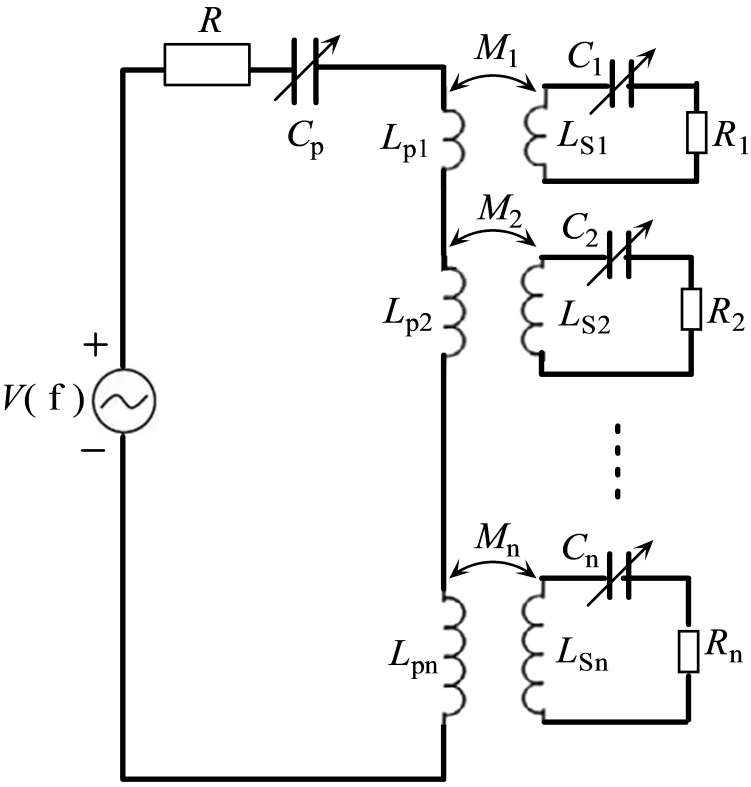 在图1中,充电系统由供电端和接收端组成,供电端包含高频交流电源V (f)、调谐电容CP和多个电感LP1、LP2、……LPn。电感LP1、LP2、……LPn是分别与副边也就是各个负载电器的耦合电感相耦合完成电能传输。LP1、LP2、……LPn串联在一起构成了感应电能传输系统的原边电感。系统接收端也就是充电系统的副边由n个独立的用电负载组成,每个负载通过自身耦合电感LS1、LS2、……、LSn从原边感应取电。图中Mi (i = 1, …, n)是第i个负载的副边与供电端与之对应的原边之间的互感系数。Ci (i = 1, …, n)是第i个负载的副边的调谐电容。R是原边的内阻。Ri (i = 1, …, n)是第i个负载的负载电阻。系统的原边的电感被分开成多个串联的线圈,是因为每个电器负载的副边线圈的物体特性不同,无法使用规格一致的原边线圈为其供电。原边的各个线圈的匝数和尺寸一般是不同的,具体参数需根据负载电器的特性设计,目的是保持电能的高效传输。在实际的安装过程中,原边的各个线圈之间要间隔有足够远的距离,防止线圈之间的互感干扰。另外每个原边线圈与对应的负载副边线圈的物理参数也并不相同,而是视实际需要而定。