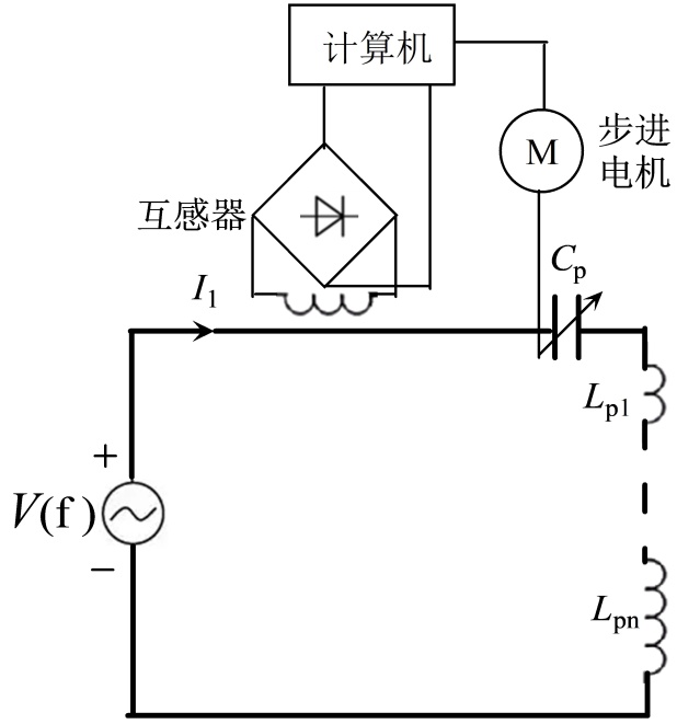 调谐的目的是使失谐的原边系统回复到谐振状态。调谐方法采用最大电流法[9],其基本原理是:当系统的硬件参数稳定时,谐振状态下串联电路的电流最大,反之电流减小。硬件的参数发生变化后,系统失去谐振状态,但是仍然存在与新的谐振状态对应的理论上的电流最大值,即系统处于谐振状态的电流值。因此通过监测串联电路的电流值即可获知谐振状态[9]。当系统中一个或多个负载变化时,系统会失谐,对于失谐的系统,当交流电源电源V (f)的频率不变时,每个负载都可以通过动态调节自身电感或电容的值保证本负载系统重新进入谐振状态。本文采用的调谐方法是调节电容CP的值,使其动态适应电路的工作状态。