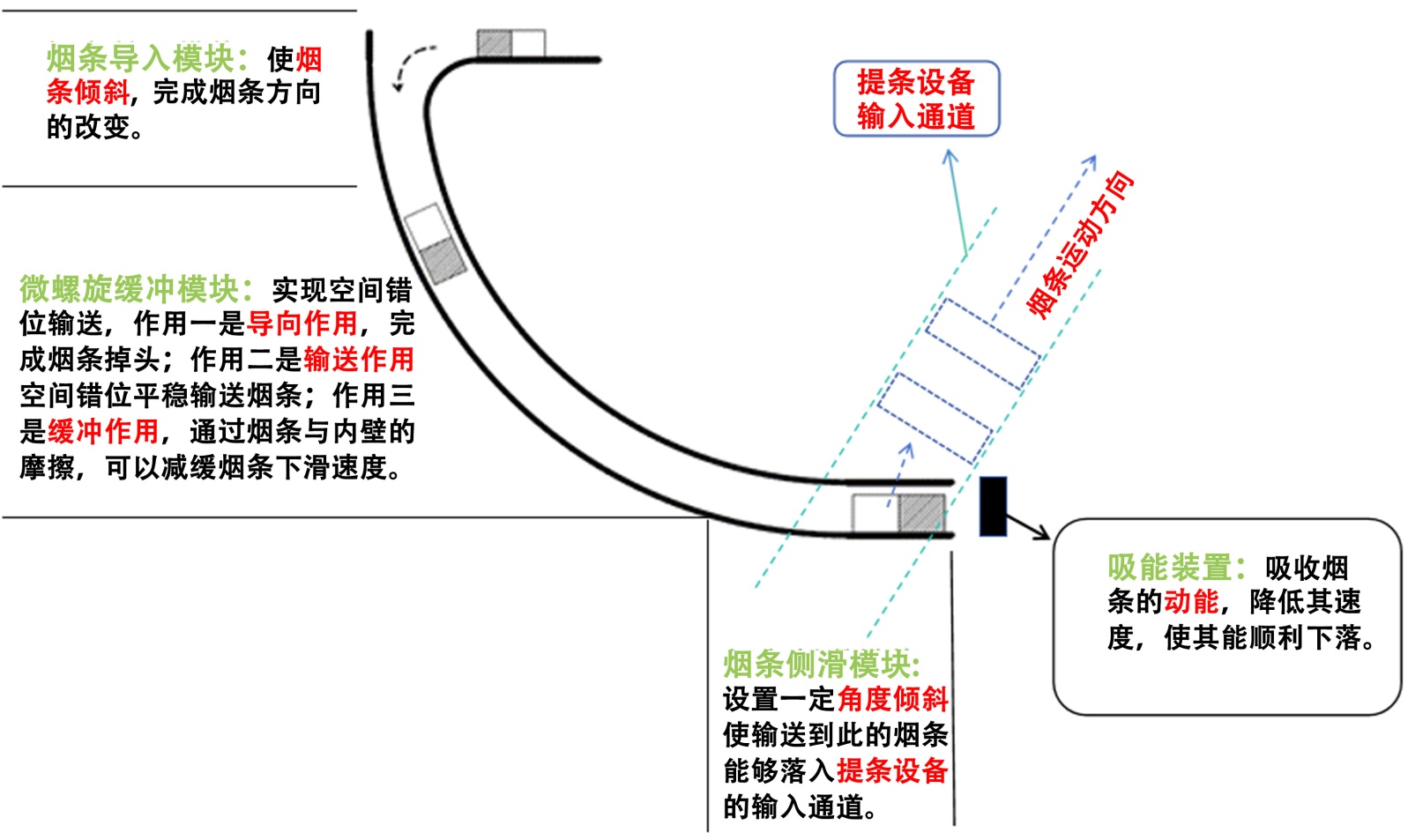 烟条导入模块使烟条倾斜,完成方向改变;微螺旋缓冲模块实现空间错位输送,兼具导向、输送和缓冲功能,通过烟条与内壁摩擦减缓下滑速度;吸能装置吸收烟条动能,降低速度,确保顺利下落;烟条侧滑模块设置倾斜角度,使烟条落入提条设备输入通道。如下图2所示: