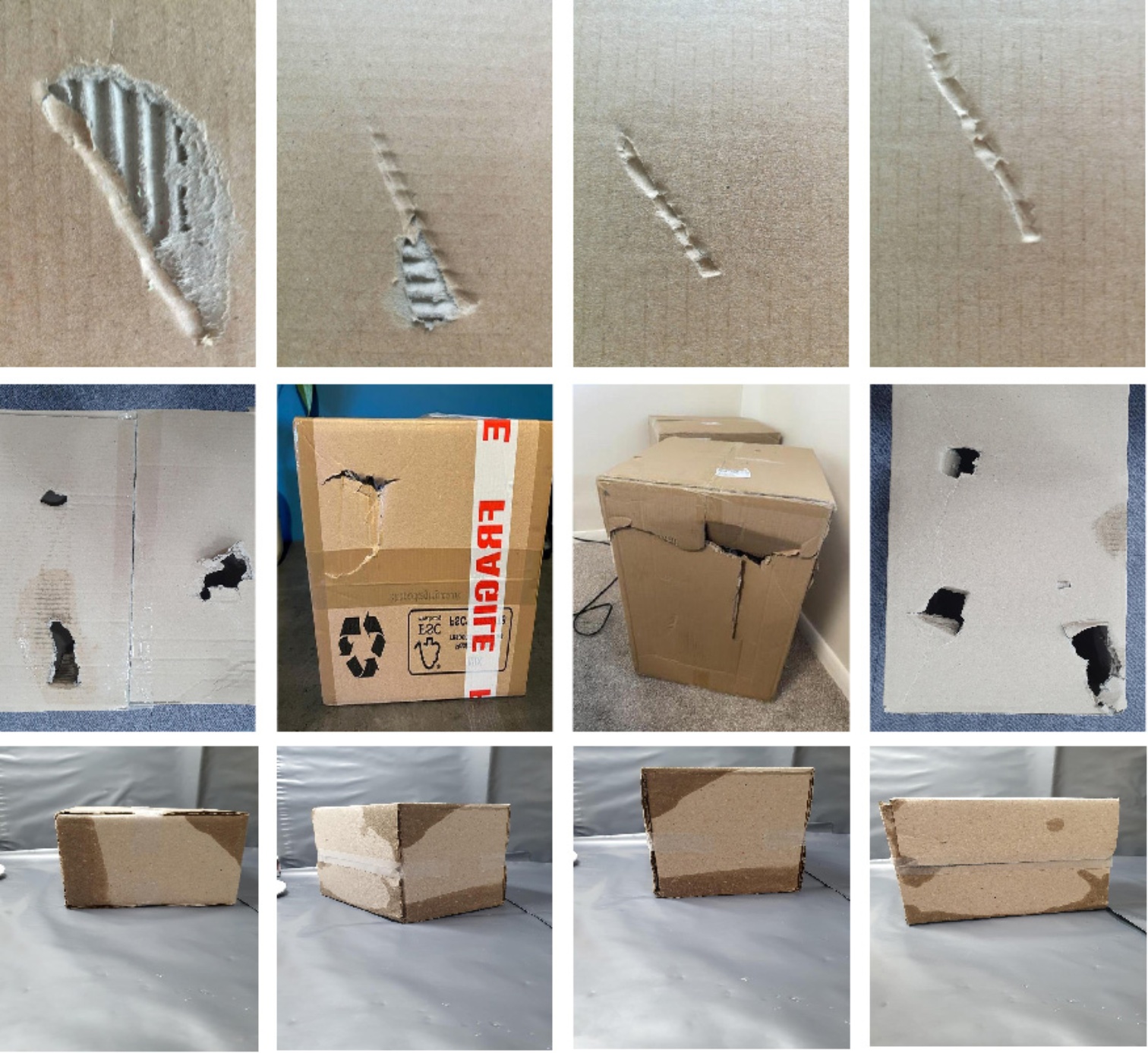 考虑到部分典型损伤在实际物流中难以系统的大量收集,研究团队在实验室环境中搭建纸箱破坏模拟平台,使用常规快递纸箱制造多种典型损伤场景。具体包括人工划刻制造线状划痕、工具压制生成压痕与戳穿箱体制造孔洞、滴水与喷雾构造局部湿渍区域等操作。拍摄设备采用手机(iPhone 16,4800万像素),在均匀漫反射LED光源条件下完成图像采集。通过设定多角度拍摄与亮度强度,获取了高质量、多视角的图像素材,确保了图像分辨率、纹理清晰度与特征完整性,适应后续训练需求。