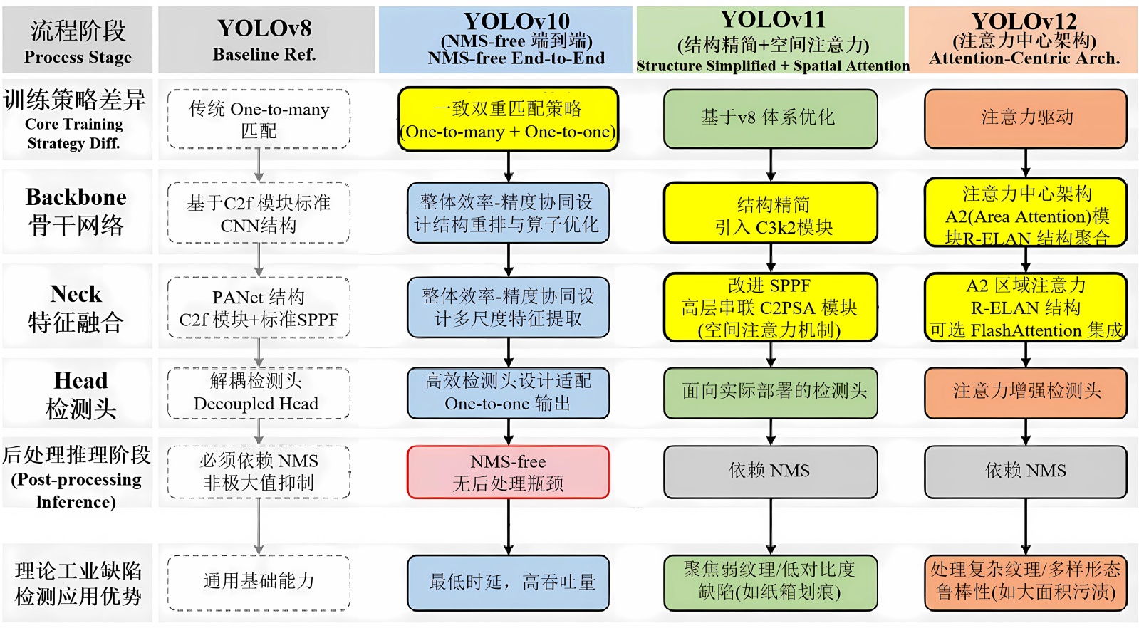 得益于Area Attention和R-ELAN的协同设计,YOLOv12在处理纹理复杂、缺陷形态多样的工业图像时具有更强的鲁棒性。在瓦楞纸箱损伤检测任务中,大面积湿渍、折角撕裂、褶皱压痕等缺陷往往伴随显著的纹理变化与形变,易受光照、污渍、印刷图案等干扰;YOLOv12通过注意力驱动的特征提取,能够更有效地从背景中分离出与损伤相关的区域,并在多尺度特征图上保持对小尺度划痕、孔洞等细粒度缺陷的敏感性。结合其在精度与推理效率上的综合优势,YOLOv12尤其适合部署于复杂工况下的自动化质检终端和仓储机器人平台,为本研究的纸箱缺陷检测提供了性能上限更高的一种模型选择。需要特别说明的是,本文中使用的“YOLO10n”“YOLO11n”“YOLO12n”并非Ultralytics官方发布的YOLO系列新版本,而是相关作者在YOLOv8n基线网络基础上构建的三种改进变体的便捷记号。其命名仅参考了官方模型的版本号风格,用于区分不同改进方案,不代表与官方模型存在一一对应关系。三种变体均以YOLOv8n为基础,在保持主干网络总体拓扑一致的前提下,分别在Backbone与Neck中引入注意力模块、轻量化卷积结构以及改进的边界框回归损失等结构性改动;各模型相对于YOLOv8n的具体差异与模块配置将在下文网络结构对比图(见图2)中给出。