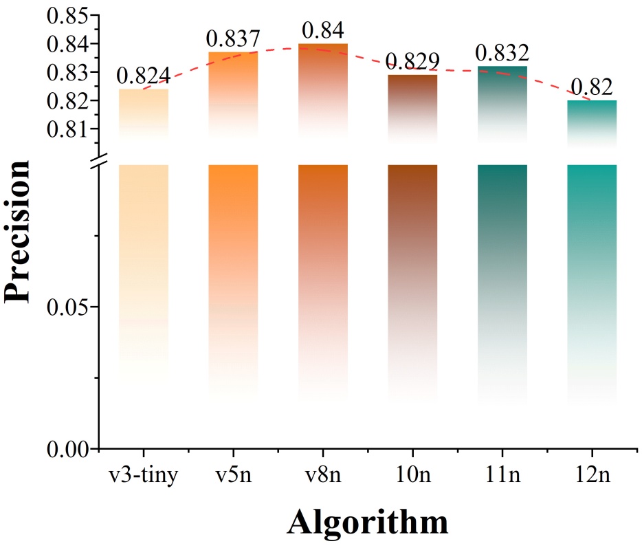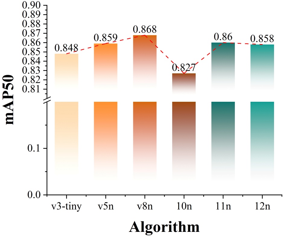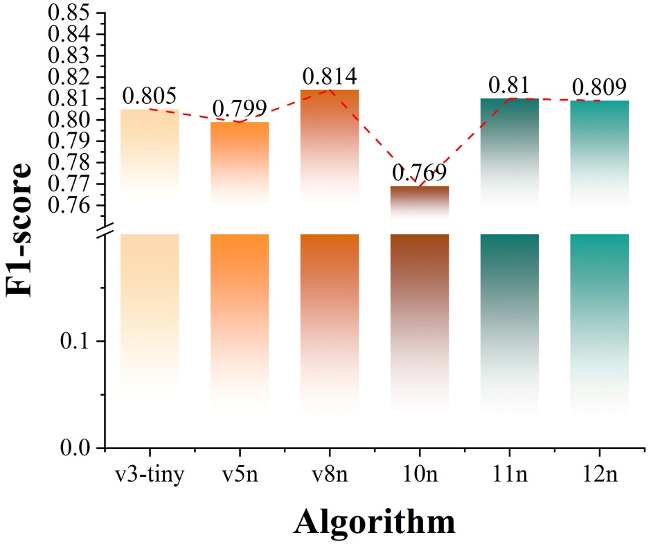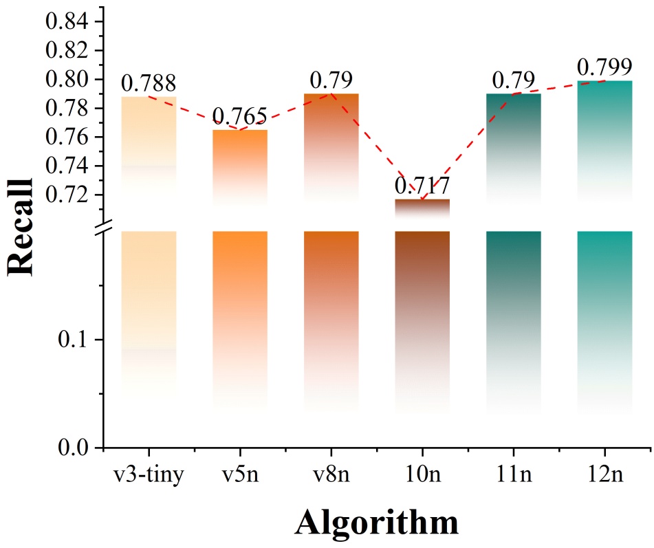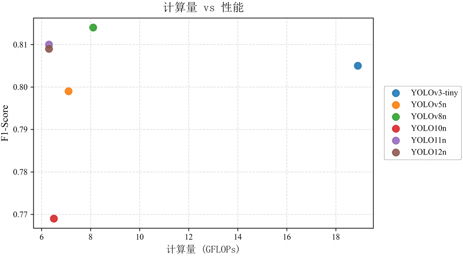 与之相比,YOLOv3-tiny的mAP50虽达到0.848,接近高版本模型,但GFLOPs高达18.9,计算复杂度超过YOLOv8n的两倍以上,说明其特征提取与推理过程存在较大冗余。其卷积结构受限于早期网络设计,特征复用率较低,难以兼顾轻量化与检测精度,因此更适合用于资源相对充足的固定检测终端,而不适合嵌入式或移动端部署。相比之下,YOLO10n、YOLO11n和YOLO12n依托新一代骨干网络与解耦检测头结构,在进一步压缩计算量的同时保持了稳定的检测性能。尤其是YOLO12n,其GFLOPs仅为6.3,为所有模型中最低,而mAP50仍达到0.858,说明该模型在参数利用效率与推理速度上取得了最优平衡,体现出后续版本在网络结构设计上的轻量化优势与泛化潜力。