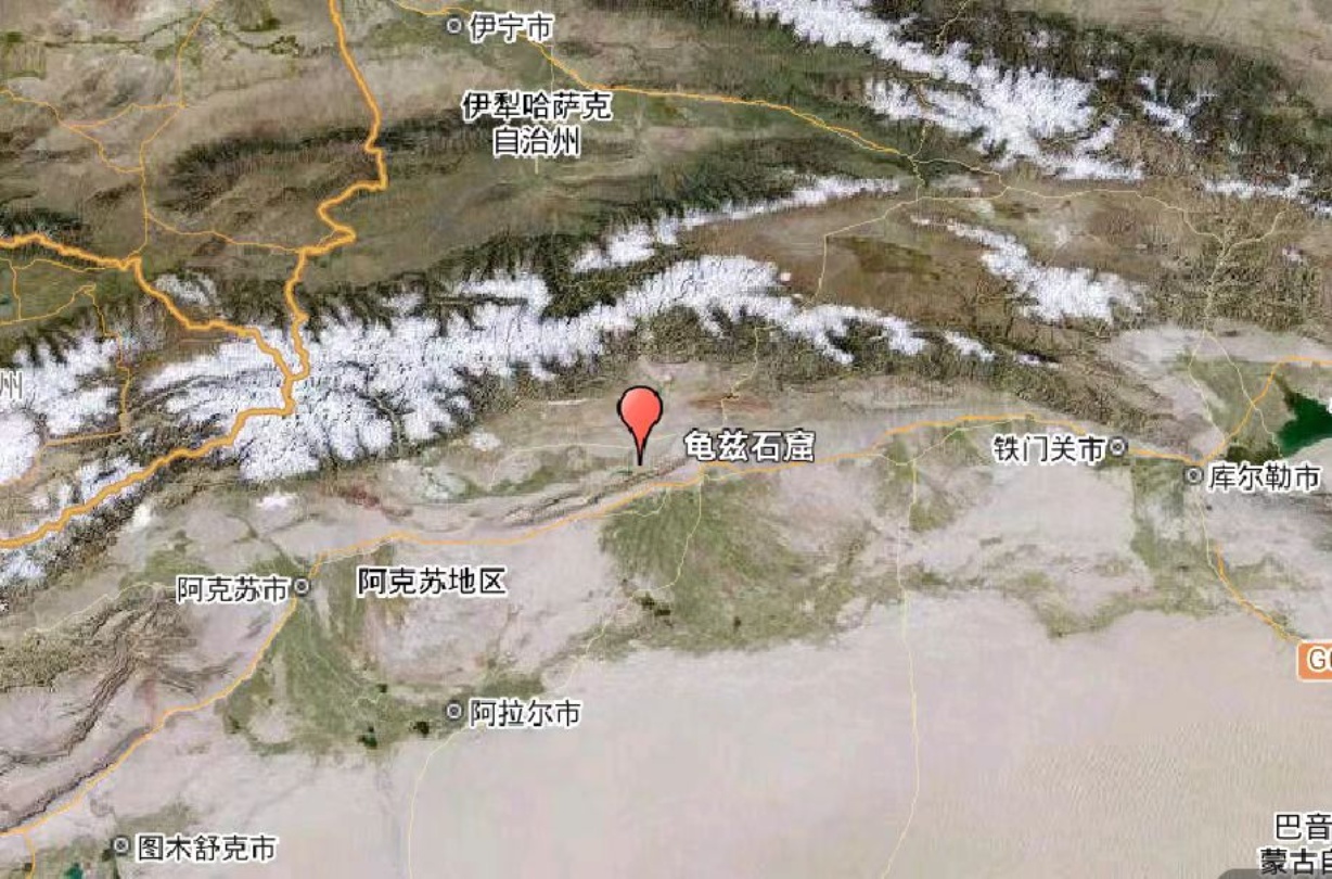龟兹石窟是中亚地区佛教艺术东传的重要里程碑,是古代龟兹地区佛教艺术与中原、印度、犍陀罗艺术交流融合的杰出范例,也是研究古代西域政治、经济、文化、宗教以及民族交流的珍贵宝库。其壁画中丰富的佛教故事、独特的人物造型与绚丽的色彩运用,生动形象展现了东西方艺术风格的碰撞与交融,让人们领略到古代西域文明的璀璨与辉煌[4]。图1龟兹石窟的位置。龟兹石窟以其精湛的艺术造诣和深厚的文化底蕴闻名于世,这些石窟群更是古代龟兹佛教艺术与文化传承的典型代表。