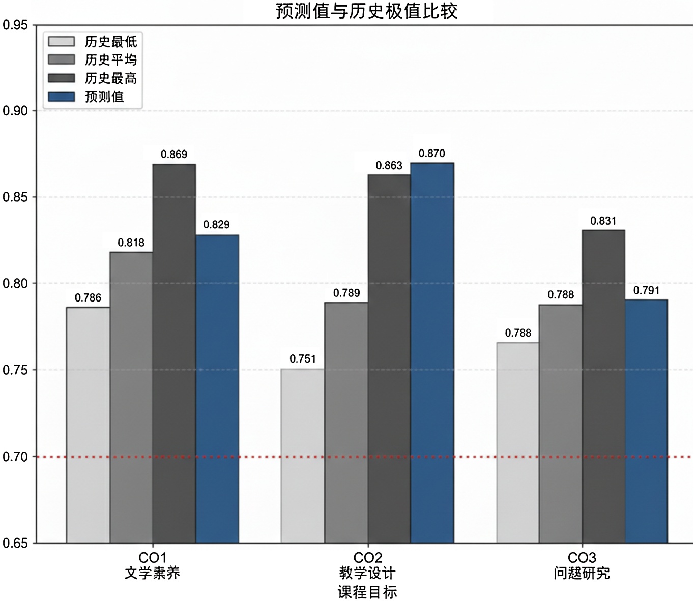 图2. 课程目标达成度历史极值、平均值与预测值对比(2022~2025)