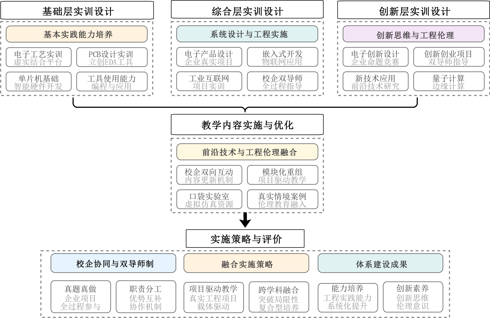 这一体系结构具有以下特点:从基础层到创新层,实践难度和复杂度逐步提升,能力培养目标由浅入深。基础层侧重于基本技能的培养,综合层强调系统设计和工程实施能力,创新层则注重创新思维和综合应用能力的提升;各层次实践环节均融入校企合作元素,如企业真实项目、企业导师指导等,增强实践教学与产业需求的契合度。校企协同贯穿整个实训教学体系,形成产教深度融合的长效机制;实践教学设计以能力培养为核心,通过不同层次的实践环节,逐步培养学生的工程实践能力和创新能力。每个层次都有明确的能力培养目标,确保学生能够逐步提升工程实践能力;将人工智能、物联网、5G通信等前沿技术融入实训教学体系,培养学生适应未来技术发展的能力。通过校企合作,引入行业最新技术和项目案例,使教学更加贴近实际;在实训教学过程中融入工程伦理教育,培养学生在工程实践中遵守职业道德、社会责任和环境伦理的能力。通过真实项目中的伦理案例分析,提高学生的伦理决策能力。“三层次递进”实训教学体系设计框图如图1所示。