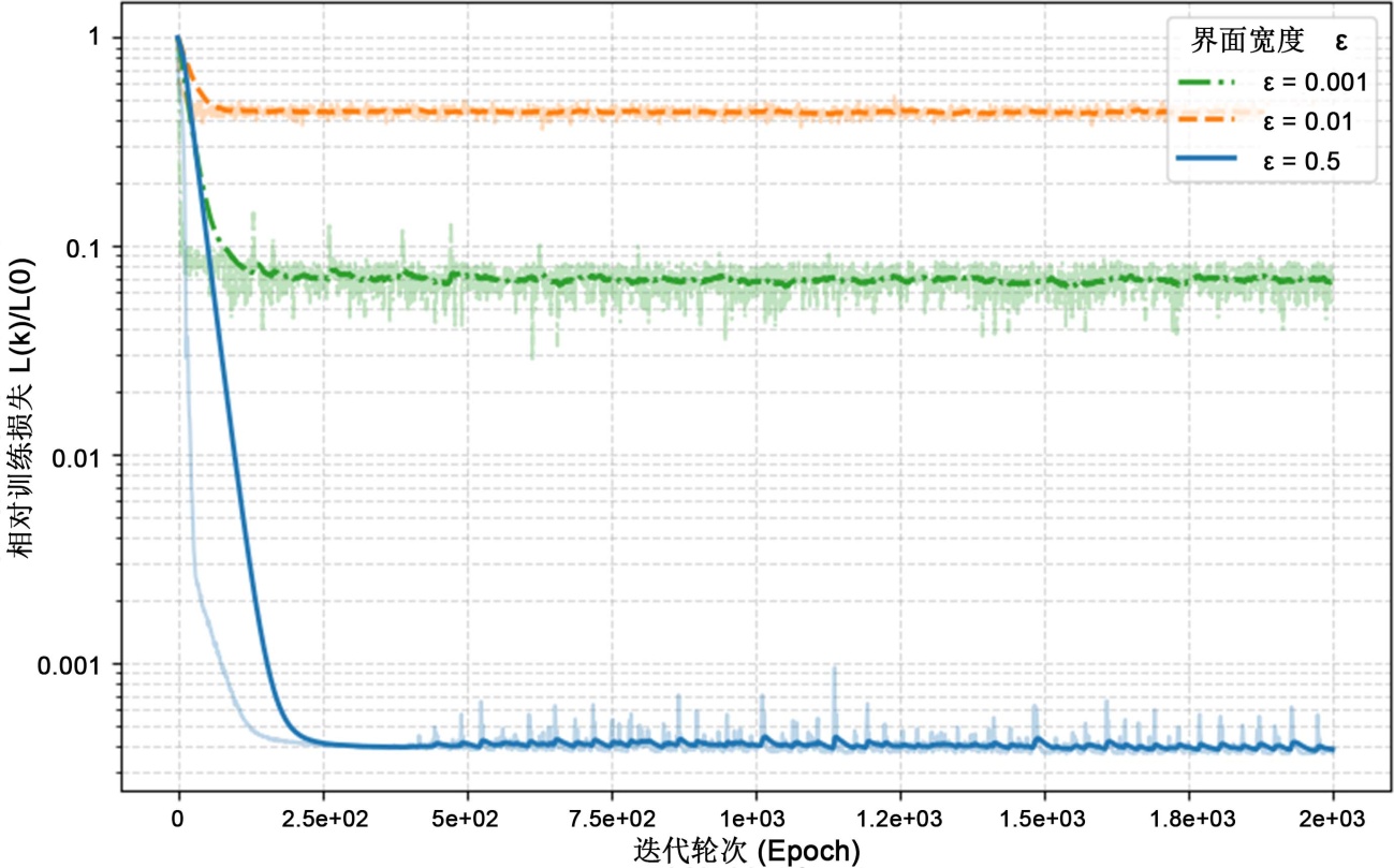 需要指出的是,对于本文研究的一维稳态Navier-Stokes/Allen-Cahn系统边值问题,在纯正向求解的计算效率方面,PINN相比于传统的BVP求解器(如基于打靶法或配置法的经典算子)并无明显优势。传统求解器利用高度优化的数值线性代数库,通常能在秒级时间内获得收敛解,而PINN的训练则需要数千轮迭代。因此,PINN的核心贡献和应用潜力往往体现在非传统数值方法所长的领域,例如处理反问题(参数识别)等。特别地,反问题在实际工程应用中,系统的物理参数(如界面宽度