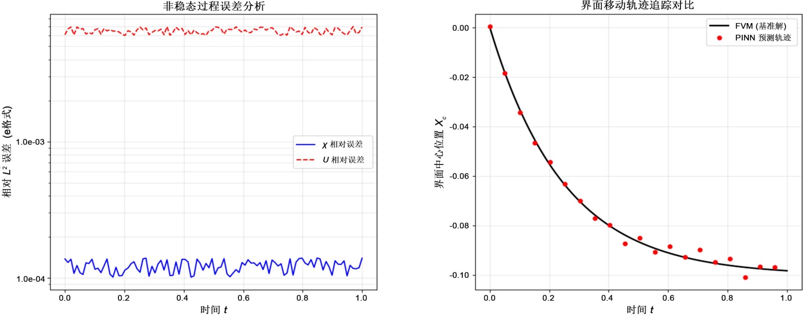 的零水平集。图12中还展示了PINN预测的界面移动轨迹与FVM基准解的对比。两条曲线高度重合,能够准确捕捉到由于速度场