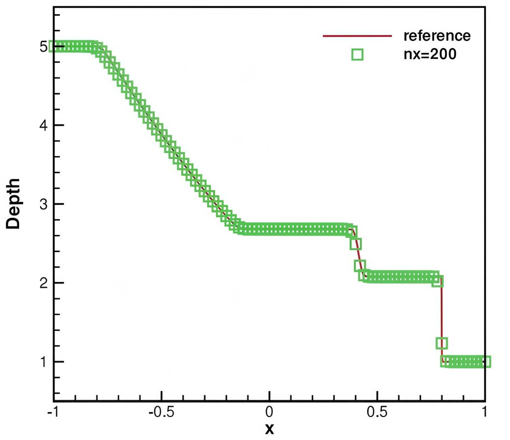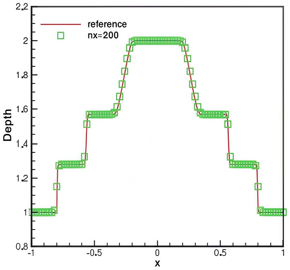 最后,我们进一步探讨了平底上的水坝破裂问题。在这一测试中,初始条件如下: