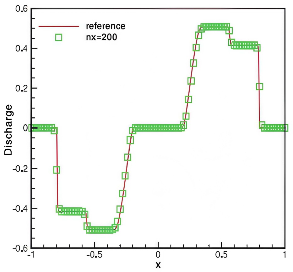 进行离散(见第3.3节),从而在所考虑的静水平衡解上,使离散层面的通量梯度与源项项在网格点处严格抵消。需要强调的是,本文采用纯有限差分的点值框架:离散未知量