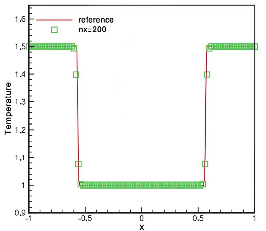 计算区域为[−1, 1]。该格式对温度相关项具有良好的稳定性。本算例在含不连续底形的稳态保持算例中未观察到此类伪波,侧面验证了所提方法对地形–温度耦合的鲁棒性。我们的数值计算在时间t = 0.2时进行,并与参考解进行了对比,见图2。