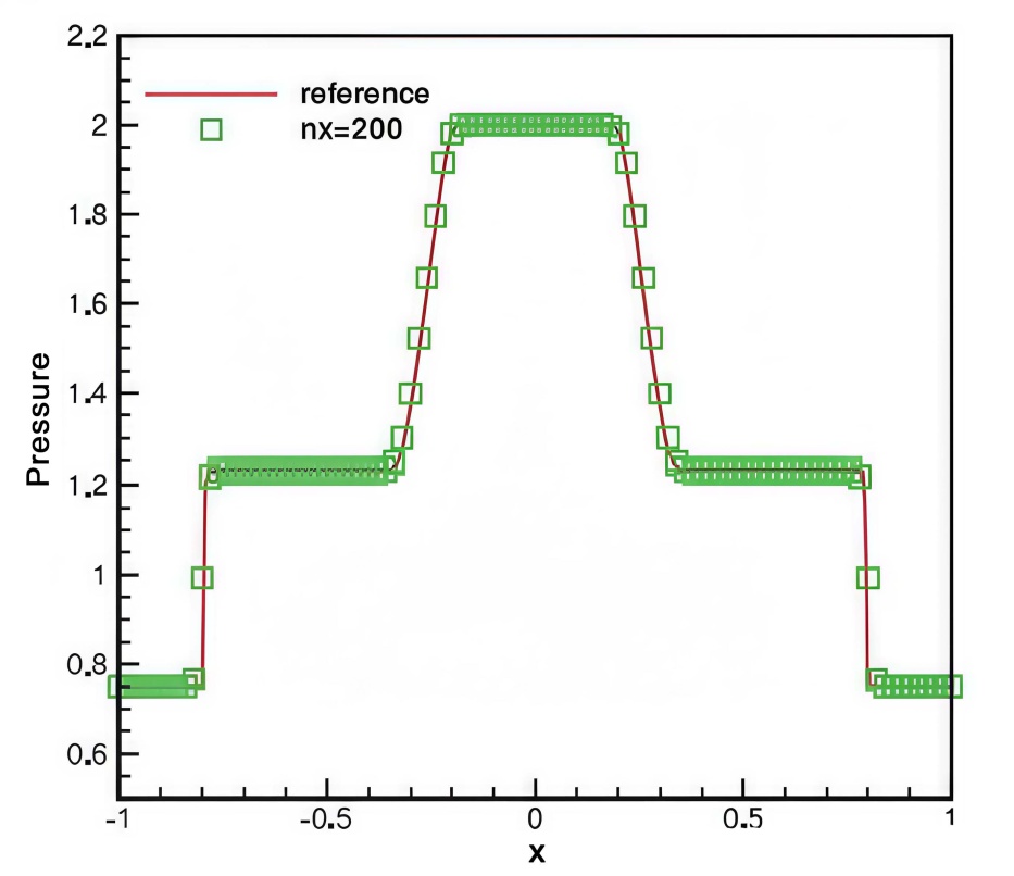 )下的黎曼问题来检验本文五阶A‑WENO格式在捕捉间断、分辨波结构以及保持无振荡性方面的性能。这里采用水坝破裂(dam‑break)型初值作为测试。