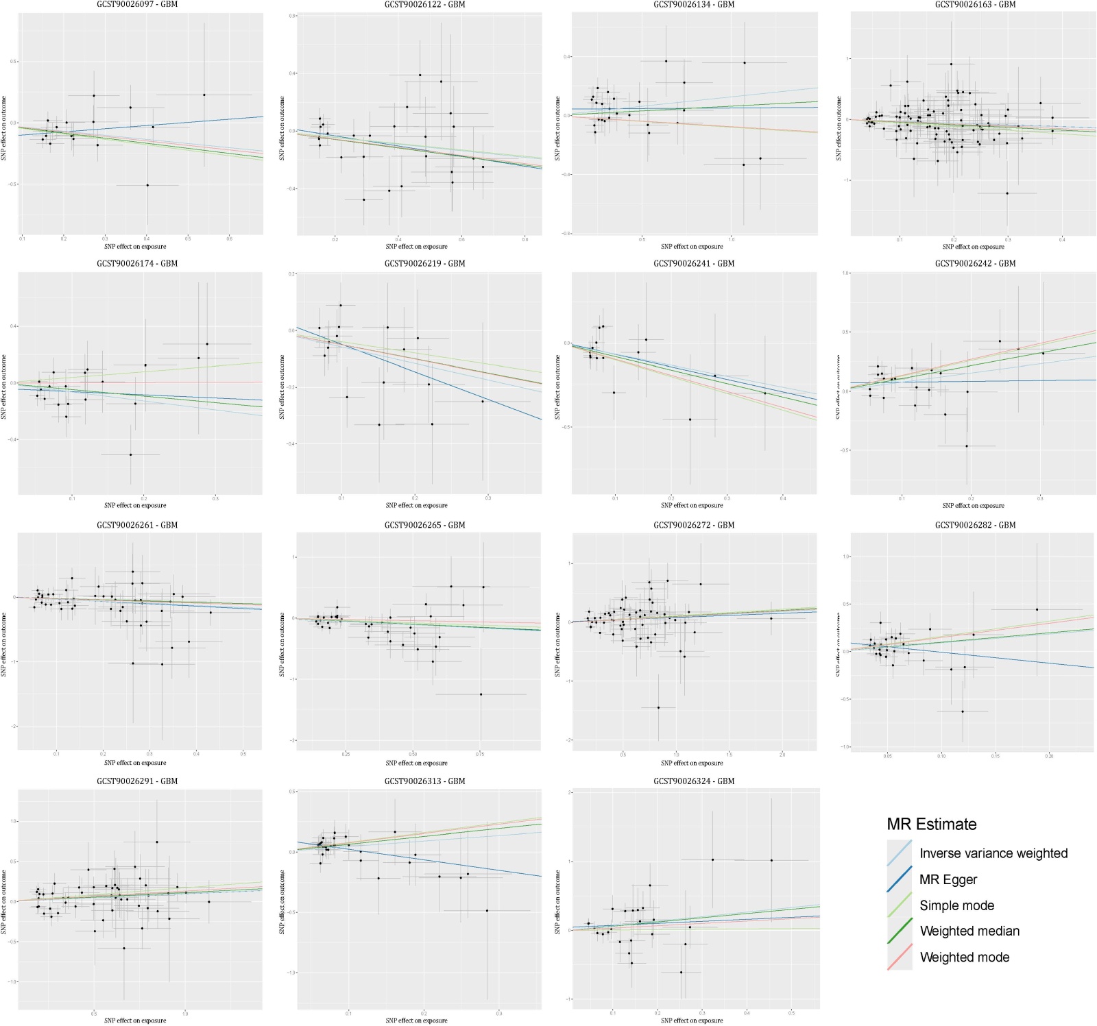 本研究采用2SMR方法,发现了15种CSFM与GBM之间存在可能的因果关系(表1),其中8种代谢物具有保护作用(OR < 1)、7种具有风险作用(OR > 1),各CSFM与GBM的2SMR散点图如图1所示,水平多效性及异质性检验的结果见表2。