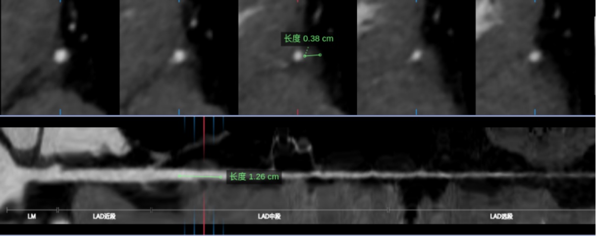 在本研究中,MB-MCA的长度与厚度测量均基于CCTA的收缩期图像进行,以准确反映心肌收缩时对血管的压迫特征。将所有冠状动脉图像数据导入后处理工作站,运用多平面重建(MPR)和曲面重建(CPR)等技术进行形态学参数提取。MB厚度的测量在垂直于MCA走行的MPR图像上进行,于收缩期选取心肌桥压迫最深的位置,测量从心肌外膜至动脉血管外侧壁的最大垂直距离,作为MB厚度[7]。MB-MCA长度的测量则在CPR图像上完成,于收缩期确定其入口(即开始被心肌覆盖的位置)与出口(心肌覆盖结束的位置),测量该段血管的长度即为MB-MCA长度(图2) [8]。为减少心肌桥导致的血管位移伪影对测量准确性的影响,本研究采用以下质量控制措施:① 所有图像均在收缩期重建,以最大程度减少运动伪影;② 对于图像中存在明显阶梯状伪影或血管边缘模糊者,予以排除;③ 所有测量均在MPR与CPR图像上反复确认,确保测量平面垂直于血管走行。所有测量工作由一名具有5年及一名具有8年CCTA诊断经验的心胸影像诊断医师独立完成。采用组内相关系数(ICC)进行观察者间一致性检验,结果显示两位观察者的测量结果一致性极佳(ICC > 0.90)。对于极少数存在分歧的测量结果,经协商后取得共识,并取其平均值作为最终结果,确保数据的客观性与准确性。此外,为确保两家医院数据的一致性,所有图像均由同一组专家采用统一的标准化流程进行后处理与测量,并进行了观察者间和观察者内的一致性检验(ICC > 0.90)。