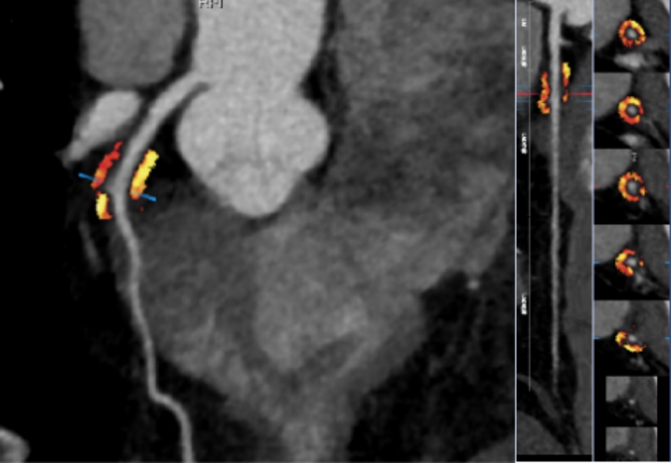 将患者收缩期原始图像上传至数坤网络科技人工智能平台进行分析,测量FAI值。FAI值以MCA-MB入口近端2 cm为纵向距离,以血管外壁直径为径向距离,测量范围为血管外壁到外圈周围组织。调整纳入计算的组织密度范围为−190~−30 HU,随后软件自动计算出斑块血管周围脂肪密度的平均值作为FAI (图3)。