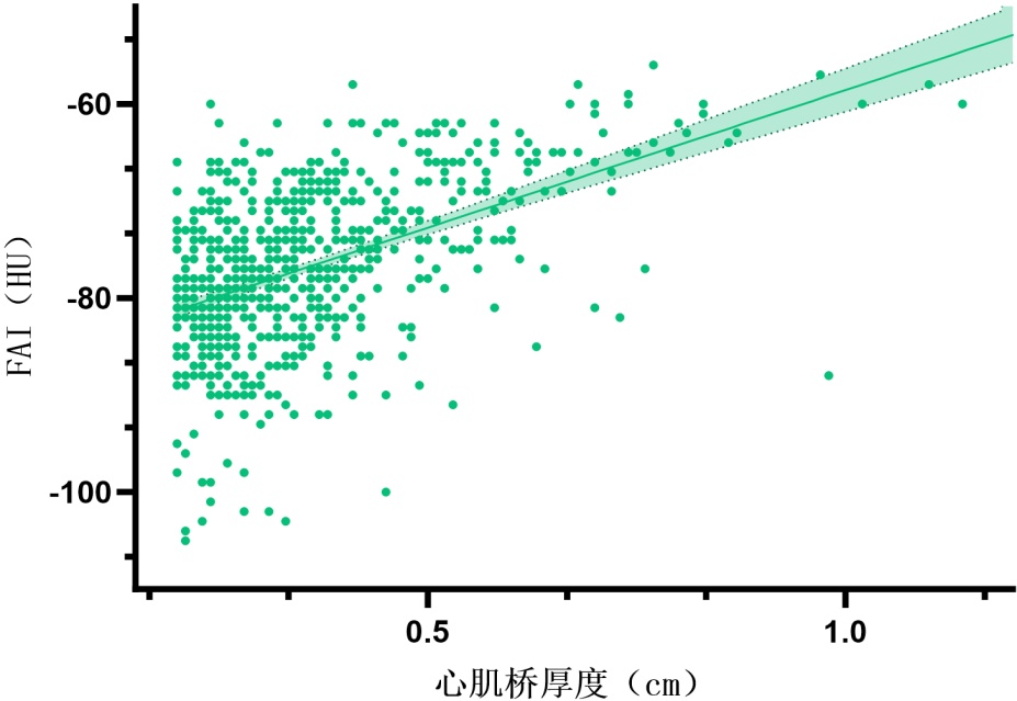 p < 0.001)。结论:左前降支心肌桥的存在,尤其是纵深型心肌桥(厚度 ≥ 2 mm),与其近端冠状动脉周围脂肪组织炎症反应增强显著相关,表现为FAI值升高。这一关联主要由心肌桥厚度驱动,而非长度。研究提示,纵深型心肌桥可能通过加剧局部血管周围炎症,在促进近端冠状动脉粥样硬化发生发展的病理生理过程中扮演重要角色。