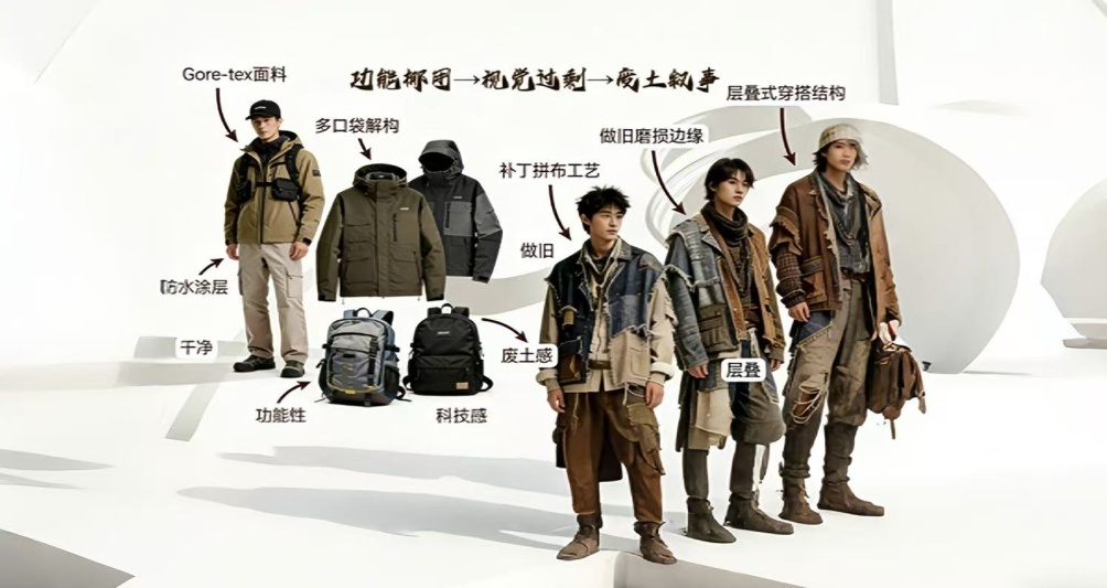 这种从“单一性能”向“异质肌理”的演变,标志着审美符号从技术崇拜向“废土美学”的升华。这种风格通过不规则的结构与肌理再造,构建出一种苍凉的科技感,将“都市生存”的韧性与“精神流浪”的叙事物化在面料之上。面料在此完成了从物理装备到“情感护甲”的终极蜕变,它不再是冷峻的工业制品,而宛若伴随穿着者在都市环境中长途跋涉的生存伴侣。通过这种异质共生的肌理符号,都市游牧风格成功地将都市生存的复杂心态转化为一种可触可感的物质性注脚,为整个都市生存叙事提供了美学支撑。