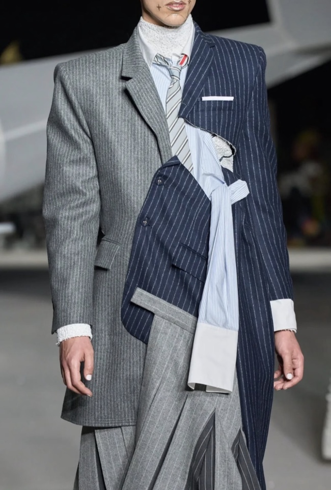 面料作为服装的“物质皮肤”,其演变逻辑构成了风格转型的感官基础。在Gorpcore盛行时期,面料选择表现出对技术的强烈追求,核心聚焦于以Gore-Tex、Cordura为代表的高性能合成纤维。以Arc’teryx (始祖鸟)为代表,其面料以高防水指标、耐磨损强度以及带有工业冷感的视觉为特征,在符号意义上被构建为“专业装备”的视觉代码,象征着对极端气候环境的物理适应能力。随后,这种追求演变为一种“功能过剩”阶段,如Thom Browne等品牌展示的冗余扣具与织带,实用功能被剥离,取而代之的是一种关于“硬核、防护”的视觉修辞。
