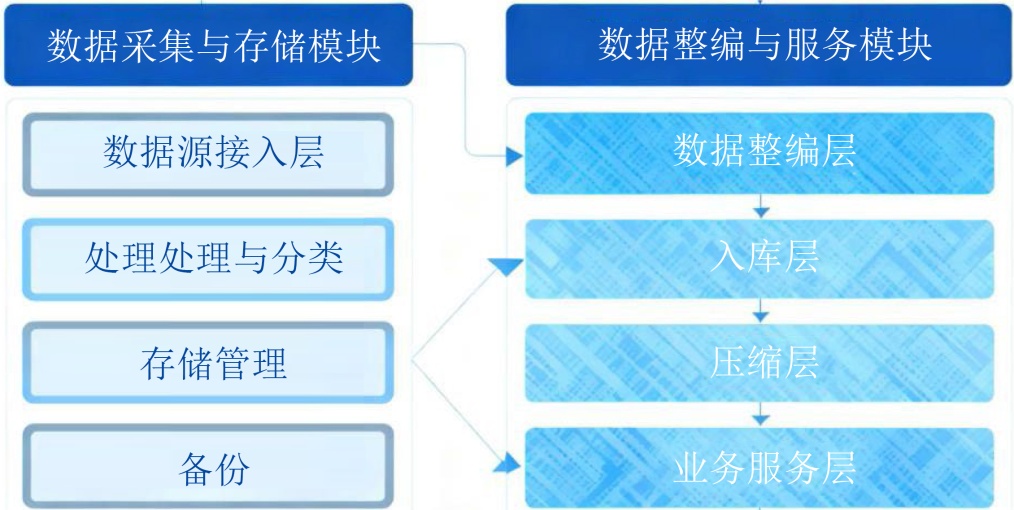新一代天气雷达基数据整编系统是在分层架构的指导下构建而成的,构建了涵盖数据存储、业务处理与用户服务的完整体系。数据存储层依托文件管理系统实现雷达数据的统一汇聚;业务处理层承上启下,集成了批量处理与分类管理等核心功能;用户服务层则最终通过标准化接口,提供数据查询、统计分析与资料下载等多元化服务。