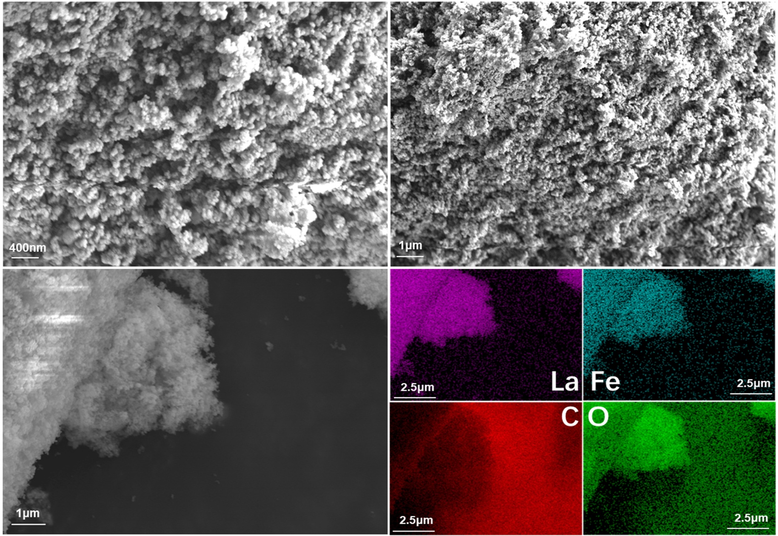 吸附材料的SEM图像见图1。牺牲生物质模板后,镧铁双金属氧化物表面形成明显的多孔结构,整体形貌疏松,相较于传统团聚型金属氧化物更有利于比表面积的提升和活性位点的暴露。EDS分析结果显示,材料中La与Fe元素均匀分布,其中La含量高于Fe,与合成过程中设定的La:Fe摩尔比(3:1)一致,表明Fe已成功掺杂并有效分散于材料结构中。此外,EDS中几乎未检测到C元素信号,说明生物质模板中的碳源已被充分去除,所得材料在保留多孔结构的同时具有较高的纯度与结构稳定性。