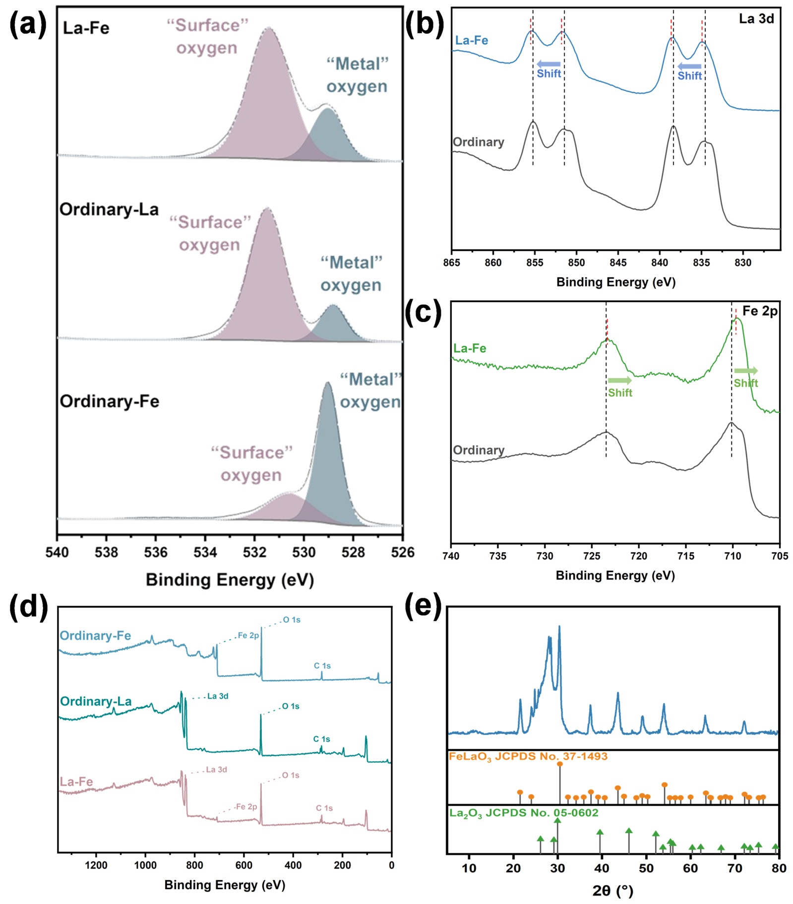 Figure 2. XPS O 1s (a), La 3d (b), and Fe 2p (c) spectra, together with the XPS survey spectrum (d) and XRD pattern (e) of the La-Fe bimetallic material