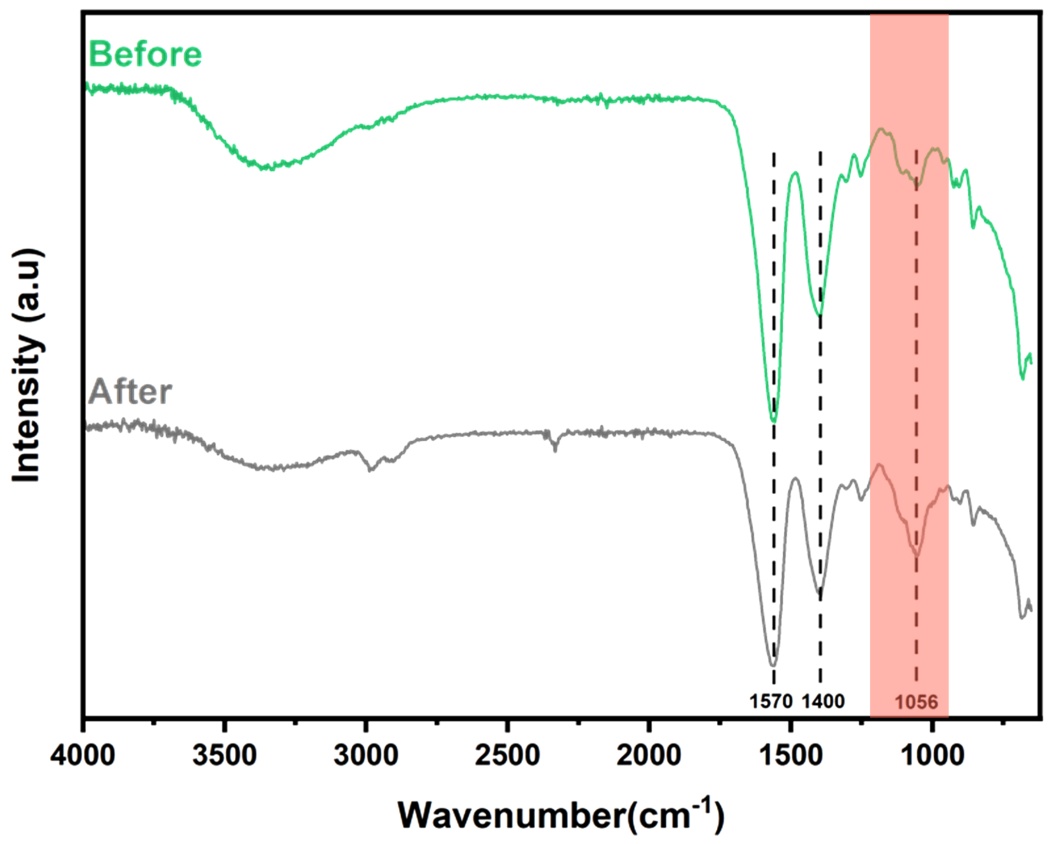 图3. La-Fe双金属氧化物吸附HEDP前后的FTIR光谱