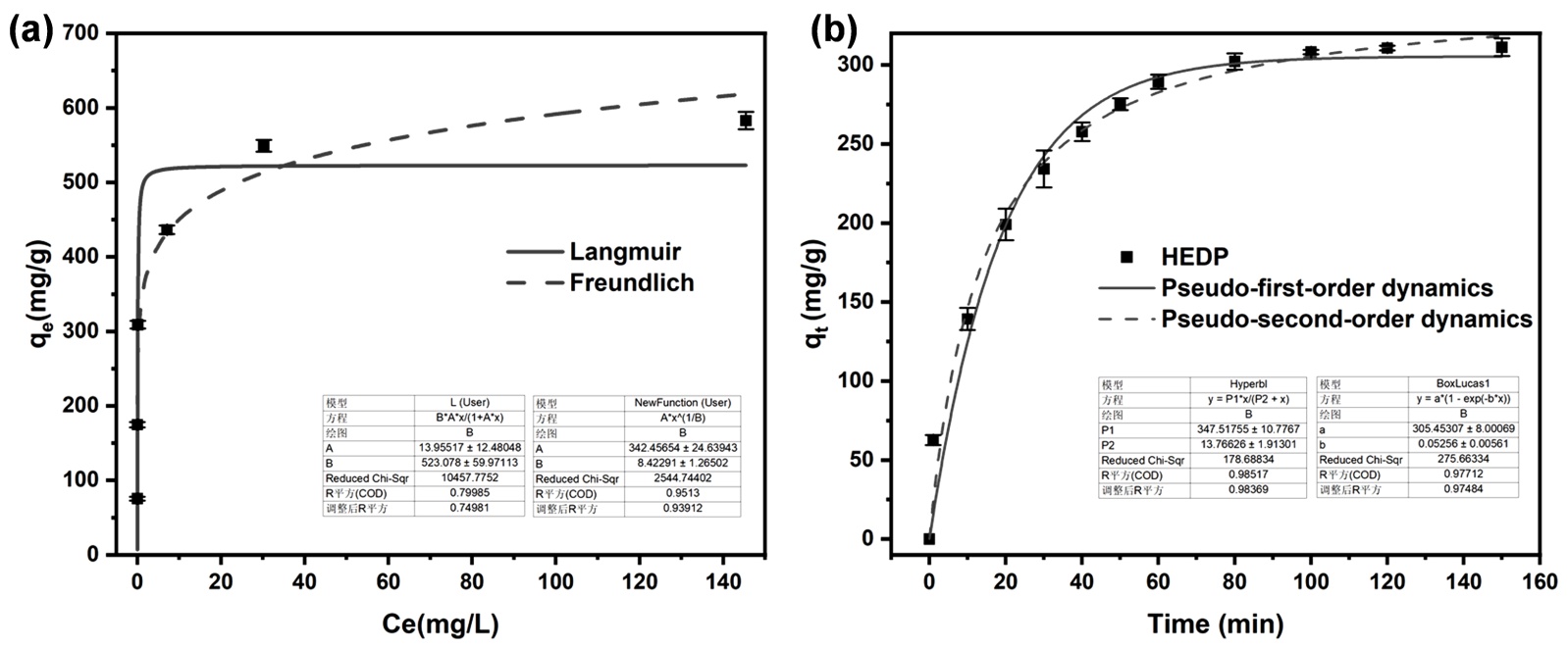 图5. HEDP在吸附材料上的等温吸附曲线(a)与动力学吸附曲线(b)