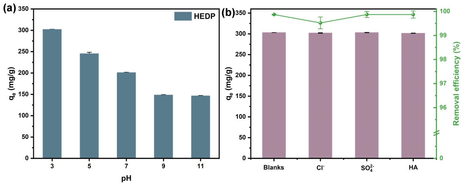 和HA几乎不影响吸附行为,表明其与HEDP的竞争效应有限。结果说明,该材料对HEDP具有较高的选择性和抗干扰能力,在常见无机阴离子及天然有机质共存条件下仍能保持稳定、高效的吸附性能,展现出良好的环境适应性与应用潜力。