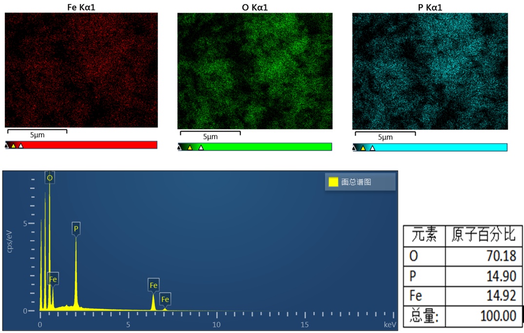 图1. c-FePO4的SEM图及对应的Fe、O、P的EDS图谱及定量分析