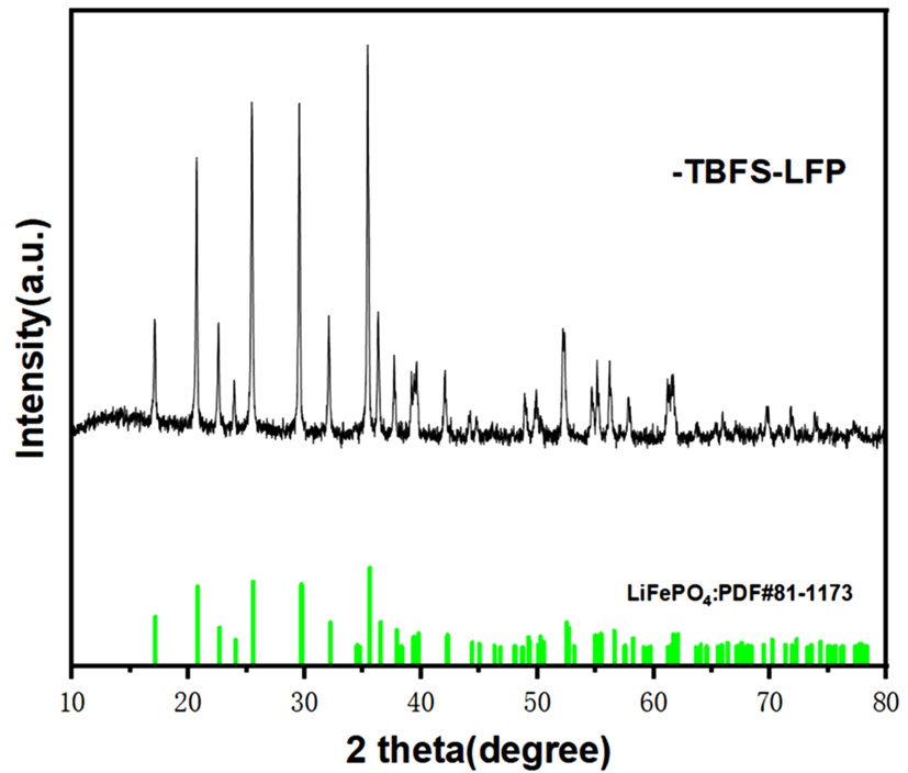 用X射线衍射(XRD)表征了用c-FP制备的TBFS-LFP 样品的结构。TBFS-LFP的XRD谱图(图2)显示出清晰的Bragg衍射峰[14],对应于具有Pnma空间基团的LiFePO4的标准正交结构(PDF 81-1173),未观察到有杂质峰,进一步表明实验制备方法的可行性。
