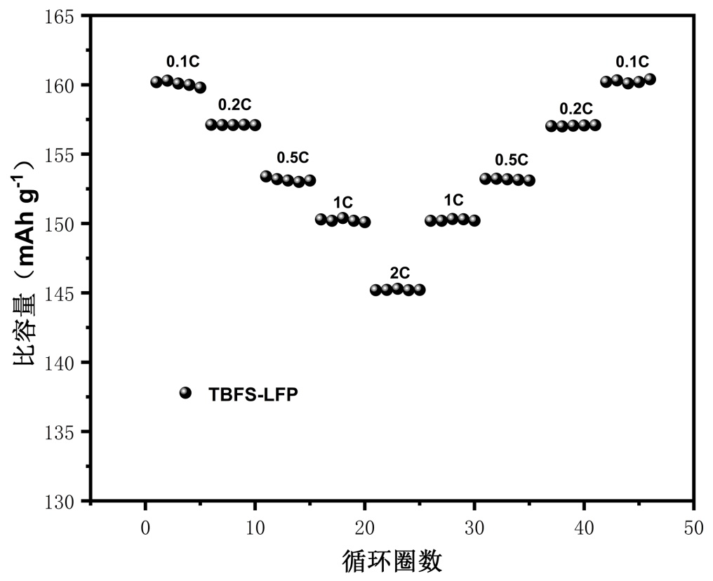 如图5所示,TBFS-LFP在0.1 C、0.2 C、0.5 C、1 C和2 C下分别提供160.1、157.8、154.3、150.5、145.1 mAh∙g−1的容量。具有极佳的倍率性能,在各个倍率下,均释放出较高的电化学比容量,且恢复到低倍率后,再次展现出优异的性能。