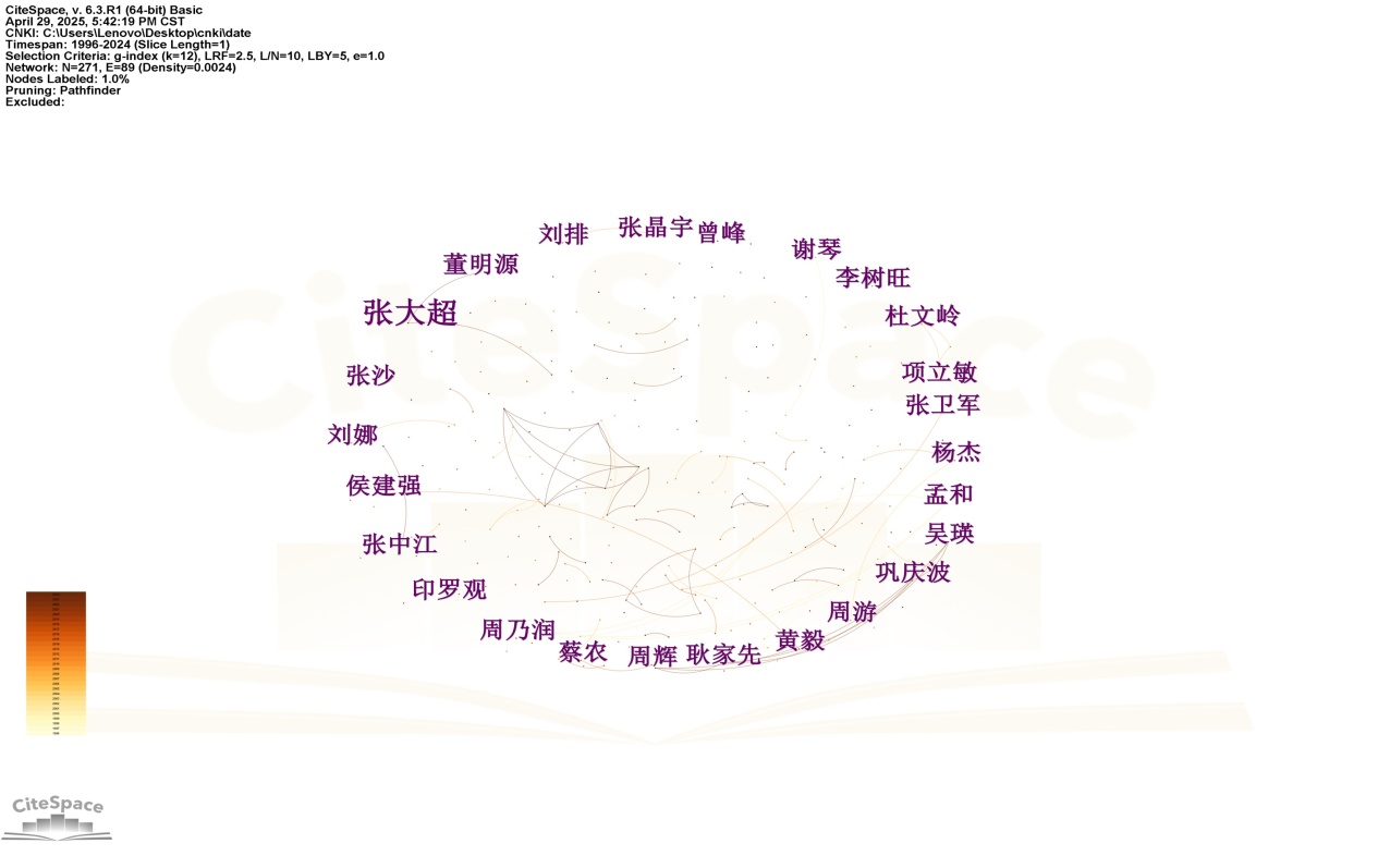 运用CiteSpace工具对国内大学生体育参与领域的相关文献进行作者共现图谱分析,然后经过系统梳理,确定了该领域发文数量排名前二十五的核心研究者(详见图2)。根据普莱斯理论,发表论文数量m篇者为核心作者,m = 0.749 (NMAX) 1/2,NMAX为最大发文量作者[7]。本研究中NMAX =3,故m = 1.3,可知发文量 ≥ 2篇的作者为该领域的核心作者,统计出大学生体育参与研究领域共有25位核心作者,其中发文量 ≥ 2篇的有25人,≥3篇仅1人,表明该领域高产作者较少,仍有大量的研究空间。该分析结果对于掌握该领域的关键研究力量以及发展趋势起到了重要的支撑作用。数据中可以清楚看到,张大超以3篇文献在发文数量上处于领先地位;其他学者以每人2篇文献紧跟其后(详见表1)。发文数量分布情况表明了部分学者在国内大学生体育参与这一研究领域中,保持着极高积极性。这些发文数据还为进一步区分该领域的主要贡献者、明确研究热点以及梳理学者间的合作网络提供了具有参考意义的信息。就目前来看,参与国内大学生体育参与领域研究的作者人数仍然比较少,出现这一情况的原因可能是学者之间的合作不够密切、研究方向比较分散、研究关注度不高等原因造成的。