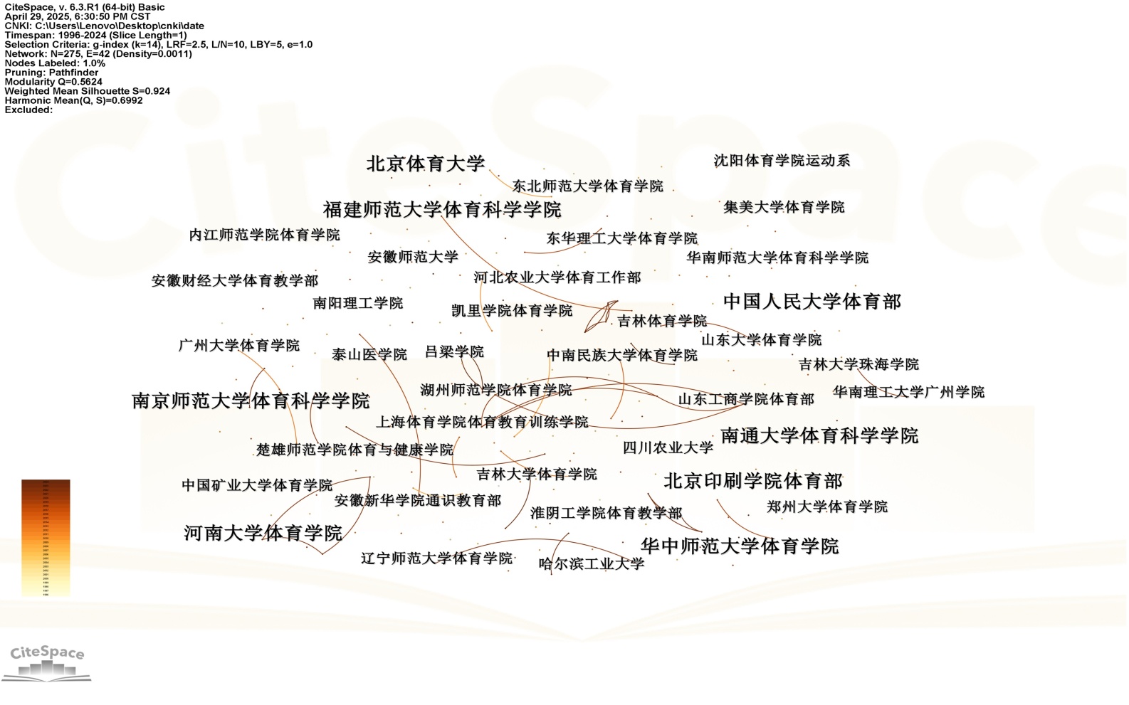 从机构性质分析,非体育类院校发文占比较高,即综合性高校主导该领域研究,从机构合作分析,该网络中包含275个节点以及42条合作连线,网络密度为0.0011,表明该合作网络呈节点分散、连线疏离的分散网特征,即机构合作交流程度不高,机构间的合作需要加强。