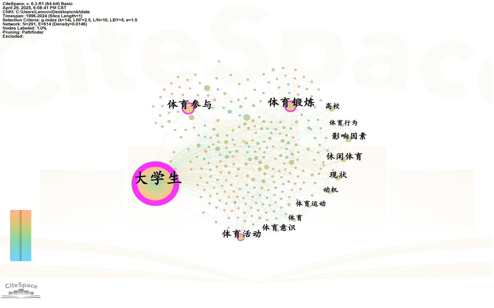 探寻国内大学生体育参与状况研究现状,发现研究热点和趋势,对提高政策执行度、完善体育教学体系都有积极的作用意义。本研究利用中国知网从1995~2025年间发布的符合选文要求的相关文献426篇,在CiteSpace科学知识图谱上从关键词共现、作者合作、机构分布、文献共被引等角度展开可视化分析,以期发现有关大学生体育参与研究的知识结构和发展前沿,探索如何使大学生体育参与由理论走向实践、政策落地到实效提高等问题。