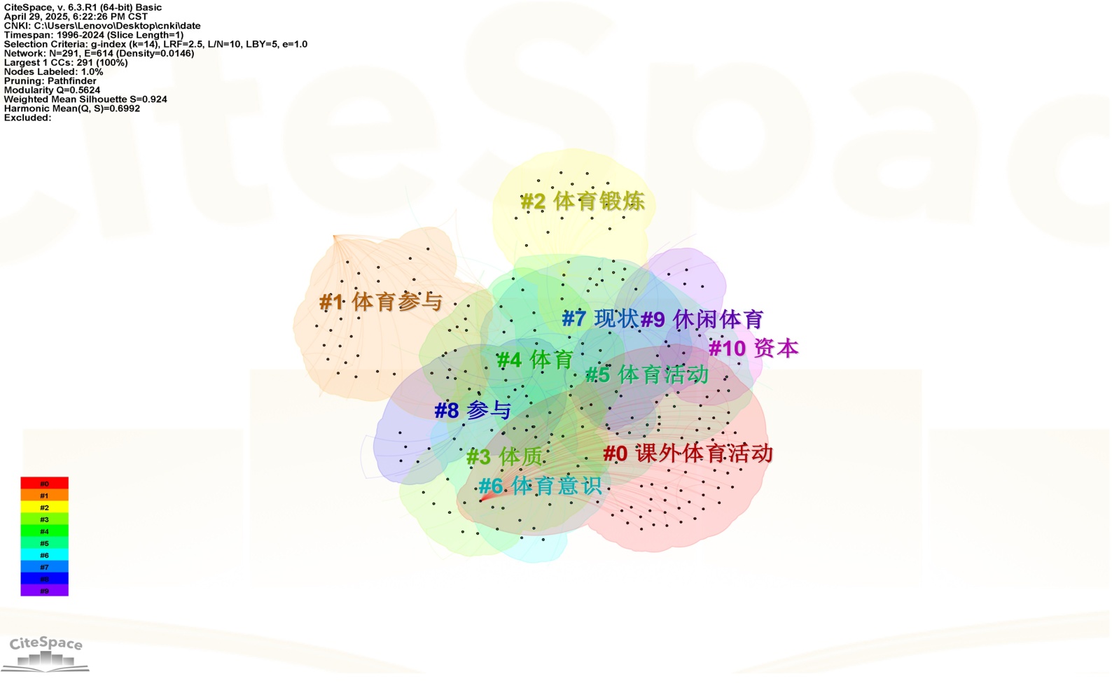 (3) 聚类分析识别出11个知识群,包括#0课外体育活动,#1体育参与,#2体育锻炼,#3体质,#4体育,#5体育活动,#6体育意识,#7现状,#8参与,#9休闲体育,#10资本,体现了研究课题的多元性、系统性。