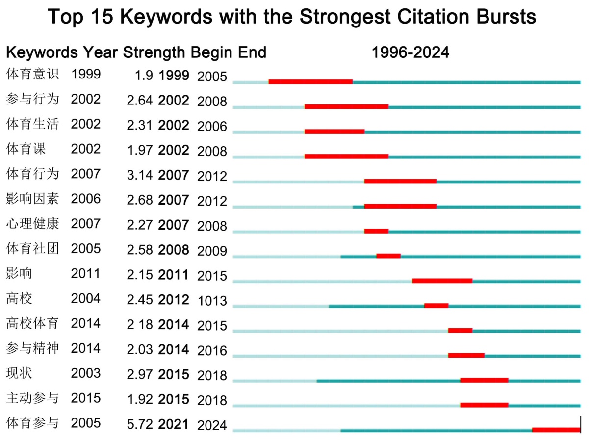 (3) 近期阶段(2015~2025年):“主动参与”(2015年至今)与“体育参与”(2021年至今)成为新一轮突现热点,强度高且持续至今,反映研究正向动机驱动、主动行为与整体参与模式等更深层次主题拓展。