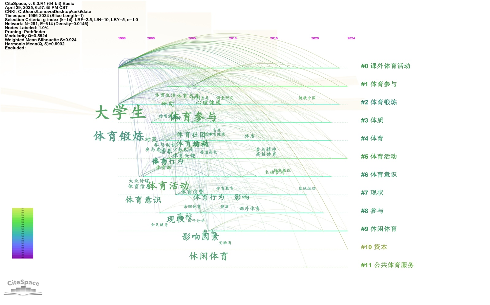 综上聚类结果,可进一步归纳出四个研究主题类别:(一) 体育参与与活动实践(含聚类#0、#1、#5、#8);(二) 体育锻炼与健康促进(含聚类#2、#3);(三) 体育认知与社会价值(含聚类#4、#6、#7、#9);(四) 体育与社会经济(聚类#10)。该分类可以体现出我国大学生体育参与研究呈现多维度、系统化的发展趋势,也可以明确当前研究的重点方向,为推动本领域持续深化与优化提供了理论支撑。