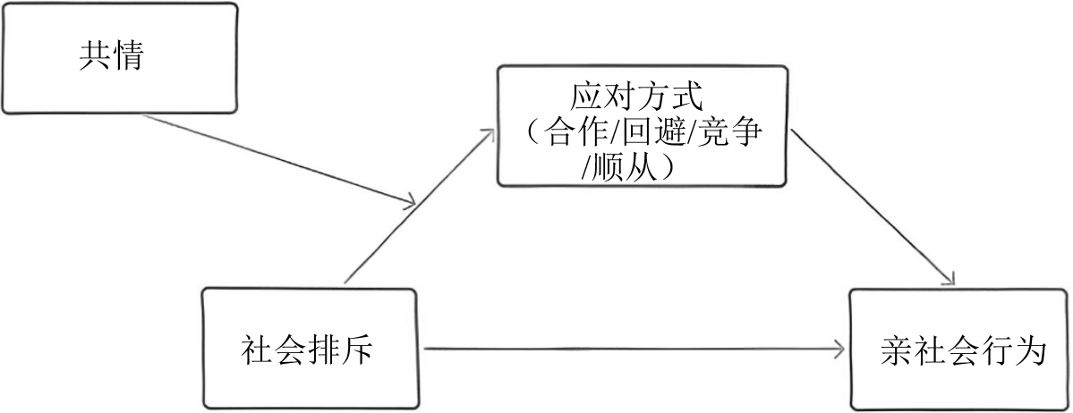 冲突应对方式,作为个体在面对人际矛盾时惯常使用的策略性反应,可能是解开上述悖论的关键中介变量。大学宿舍作为人际冲突的高发场域,其冲突来源多样,常涉及生活习惯差异、公共资源使用、作息时间不合等具体问题(耿炎,2019;杨露,2022)。根据Rahim (1983)的经典冲突应对理论,个体在冲突中可能采取合作、顺从、竞争、回避等多种应对风格。研究表明,中国大学生在宿舍冲突中最常使用合作与顺从策略(贾晓宾,2009;梁洁,2016)。合作应对作为建设性策略,有助于营造信任氛围,促进亲社会行为(Oliveira & Beuren, 2024);而竞争与回避等消极策略可能加剧人际疏离。特别值得注意的是,顺从应对在必须长期共处的宿舍情境中,可能表现为一种旨在维持关系和谐的策略性行为,在测量上近似于亲社会倾向(贾晓宾,2009)。因此本研究提出H2:宿舍冲突应对方式在社会排斥与亲社会行为的关系中起中介作用。