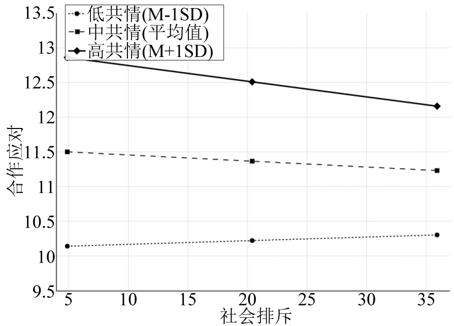 为直观展示上述调节效应,本研究绘制了不同共情水平下社会排斥对合作应对的预测图(见图2)。如图所示,对于高共情个体(图中实线),社会排斥水平的升高会显著降低其合作应对倾向;而对于低共情个体(图中虚线),社会排斥对合作应对的影响趋势平缓且不显著。这一结果直观地揭示了共情的调节作用模式:高共情放大了社会排斥对合作应对的负面影响,进而抑制了亲社会行为。