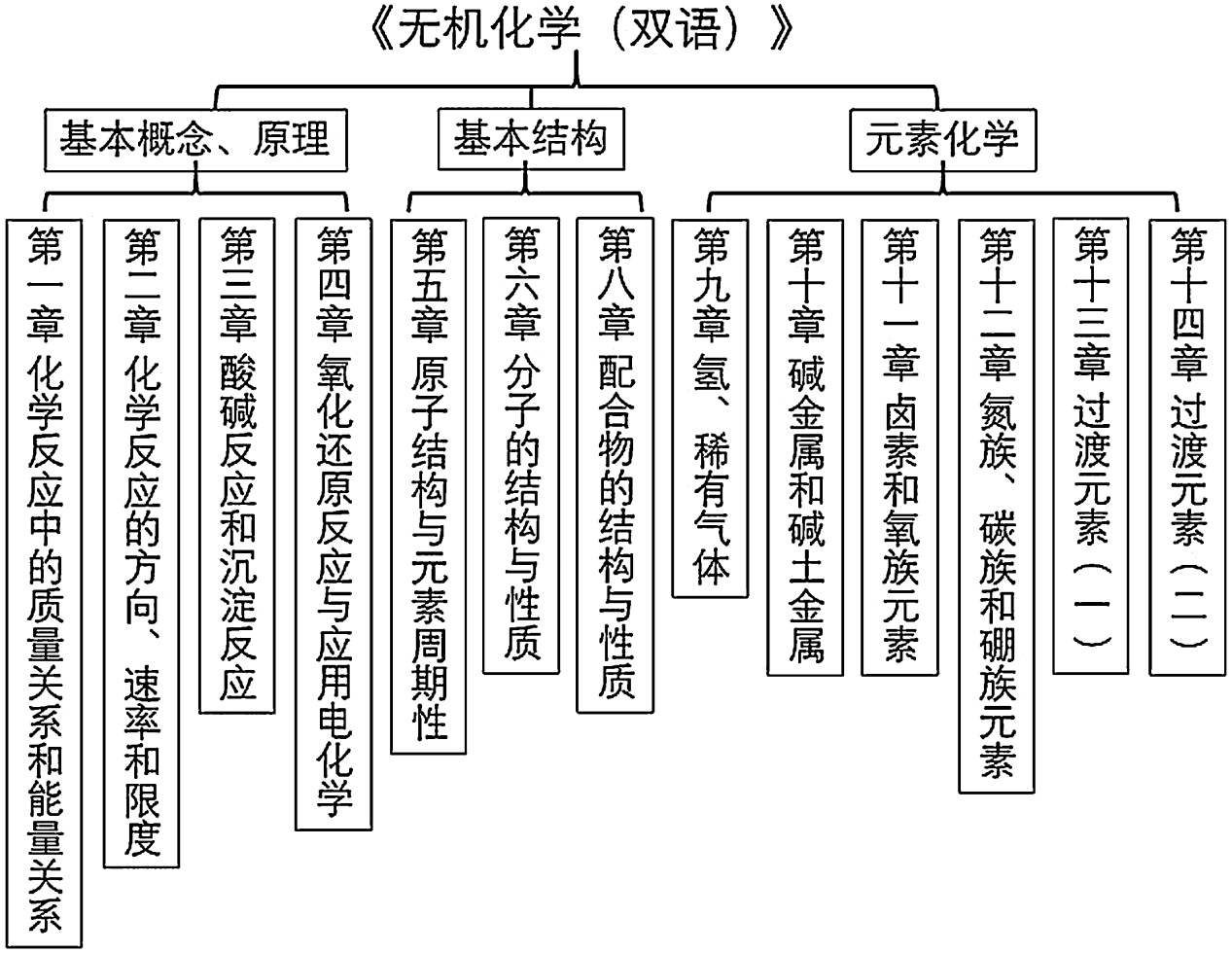 我校化学工程与工艺专业归属工科范畴,《无机化学(双语)》课程教学选用由天津大学无机化学教研室编著,王建辉、崔建中、王兴尧、秦学修订,高等教育出版社(北京)出版的《无机化学》(第五版)教材,考虑课程学时和学生高中化学基础,主讲第一章至第十四章(第七章除外)内容,如图1所示。《无机化学(双语)》课程的三大教学部分,基本涵盖了无机化学学科的核心内容,知识点繁杂、理论抽象,需要帮助