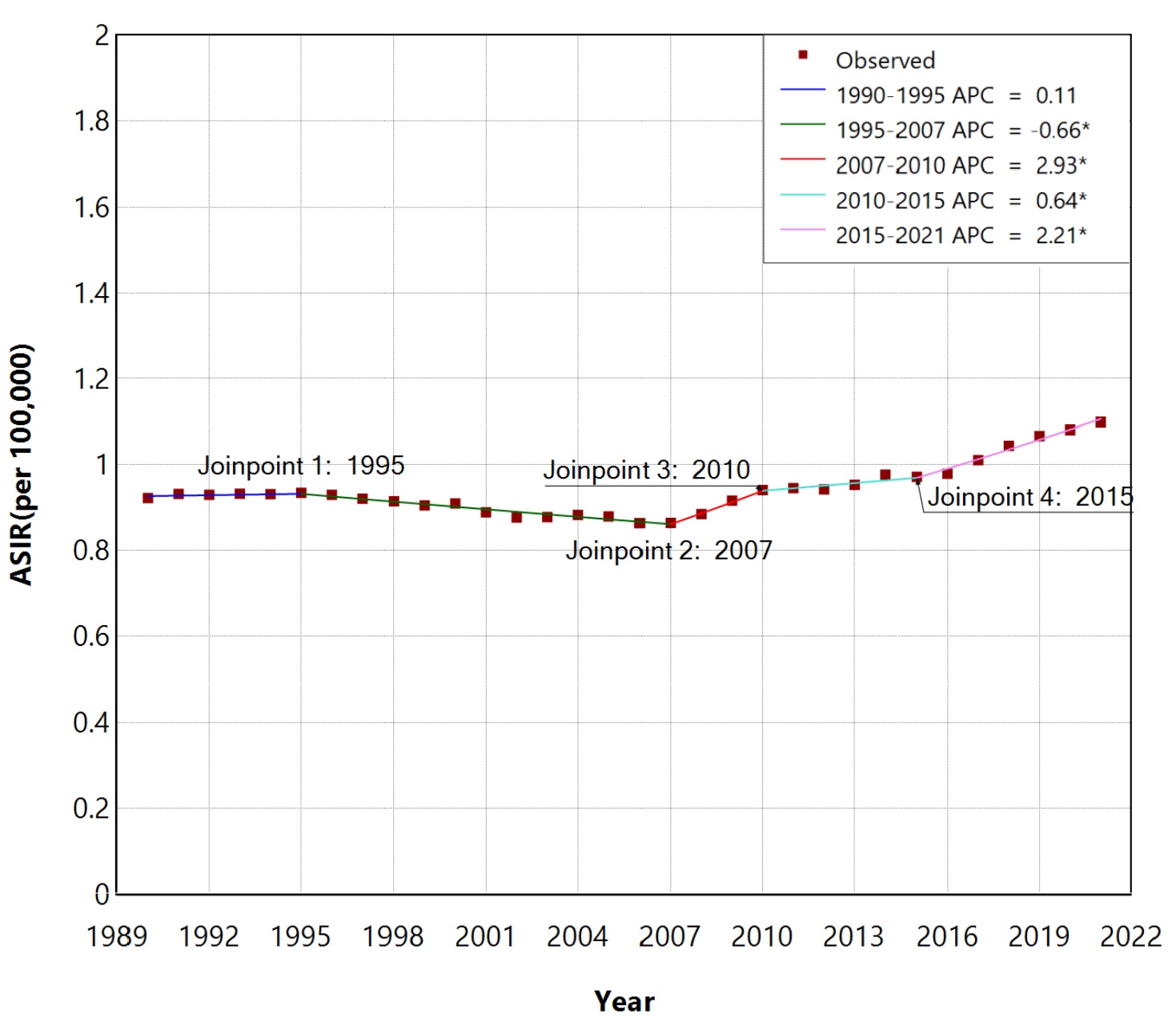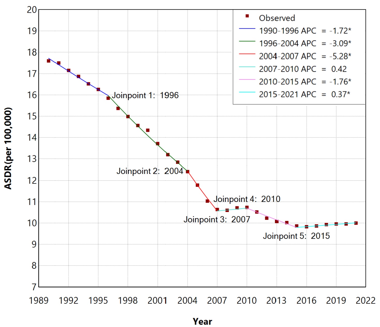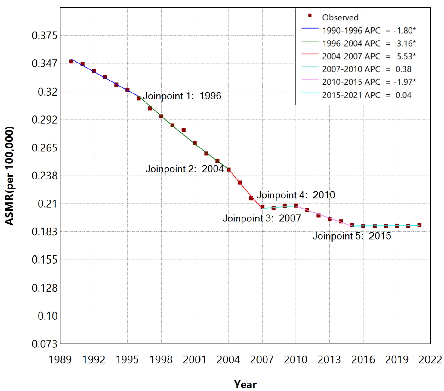 Kim, H., Fay, M.P., Feuer, E.J. and Midthune, D.N. (2000) Permutation Tests for Joinpoint Regression with Applications to Cancer Rates. Statistics in Medicine, 19, 335-351. [Google Scholar] [CrossRef] [PubMed]
