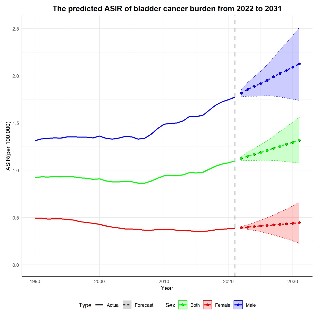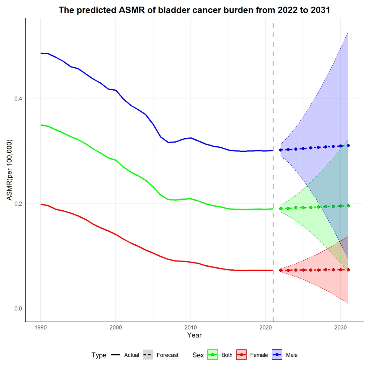 Xiang, Z., Ye, Z., Ma, J., Lin, Y. and Zhou, Y. (2022) Temporal Trends and Projections of Bladder Cancer Burden in China from 1990 to 2030: Findings from the Global Burden of Disease Study. Clinical Epidemiology, 14, 1305-1315. [Google Scholar] [CrossRef] [PubMed]
