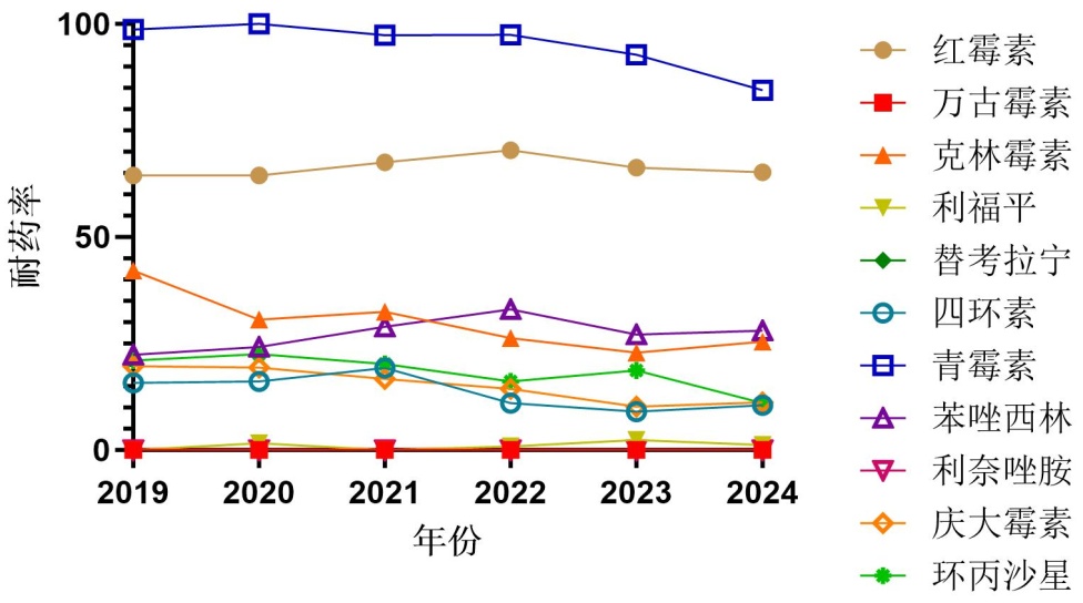 2019年至2024年六年间,肿瘤与非肿瘤疾病组金黄色葡萄球菌耐药率呈现不同的年度趋势。肿瘤疾病组中,红霉素和利福平分别保持高耐药率及低耐药率且无显著变化,青霉素长期高耐药但呈逐年下降趋势,克林霉素、四环素、庆大霉素和环丙沙星的耐药率总体逐步下降,苯唑西林的耐药率逐年攀升。非肿瘤疾病组中,红霉素和青霉素总体高耐药但显著下降,克林霉素5年间整体下降,四环素、庆大霉素、利福平和苯唑西林均耐药率整体下降态势,环丙沙星低耐药但有逐年上升趋势。两组对万古霉素、利奈唑胺和替考拉宁均100%敏感,肿瘤组需关注苯唑西林耐药上升,非肿瘤组要警惕环丙沙星耐药性的增加。万古霉素、利奈唑胺和替考拉宁三类核心抗生素的持续敏感现象是具有重要临床价值的,糖肽类药物的稳定性与其独特作用机制相关——万古霉素通过紧密结合细胞壁前体五肽末端的D-Ala-D-Ala残基阻断转肽反应,这种多位点结合模式使SA难以通过简单突变产生耐药[1]。而利奈唑胺的零耐药率则反映本院对其使用指征的严格把控(仅用于MRSA肺炎的二线治疗)。这三类药物可作为临床的“最后防线”或一线药物,它们的敏感性能显著降低治疗失败风险(如感染复发、脓毒症进展),提高临床治愈率;对于免疫力低下(如肿瘤化疗、中性粒细胞缺乏)或基础疾病重的患者,使用这三种敏感药物也可缩短病程、减少并发症。