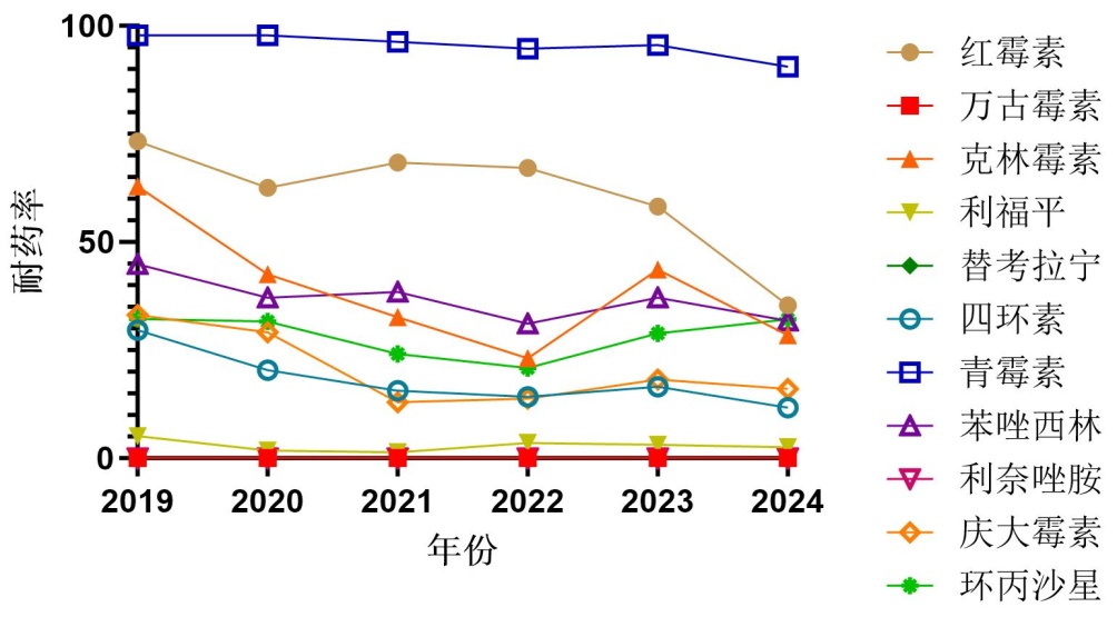 将非肿瘤疾病组疾病2019年至2024年每年间金黄色葡萄球菌的耐药率绘制柱状图,见图2。通过趋势检验P值判断耐药率随年度的变化趋势:红霉素(P = 0.000 < 0.05)、克林霉素(P = 0.013 < 0.05)、利福平(P = 0.001 < 0.05)、四环素(P = 0.000 < 0.05)、青霉素(P = 0.000 < 0.05)、苯唑西林(P = 0.002 < 0.05)、庆大霉素(P = 0.000 < 0.05)的耐药率在非肿瘤疾病组各年度间存在统计学意义的趋势变化,耐药率整体趋势保持下降;而环丙沙星(P = 0.161 > 0.05)的耐药率在非肿瘤疾病组各年度间无统计学意义的趋势变化。万古霉素、替考拉宁和利奈唑胺均未检出耐药。