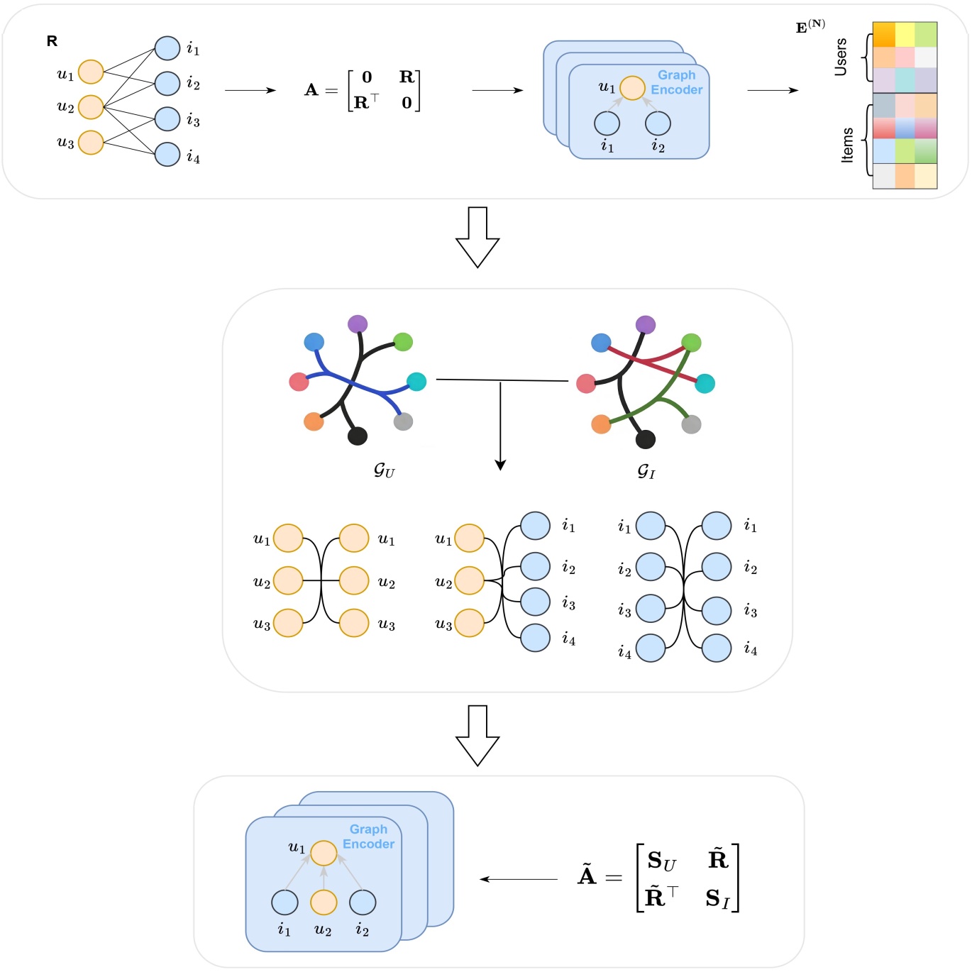 本文首先采用轻量级图卷积模型LightGCN对原始用户–项目交互图进行预训练,以获得稳定且具有判别性的初始用户与项目嵌入表示。具体而言,基于用户–项目交互矩阵