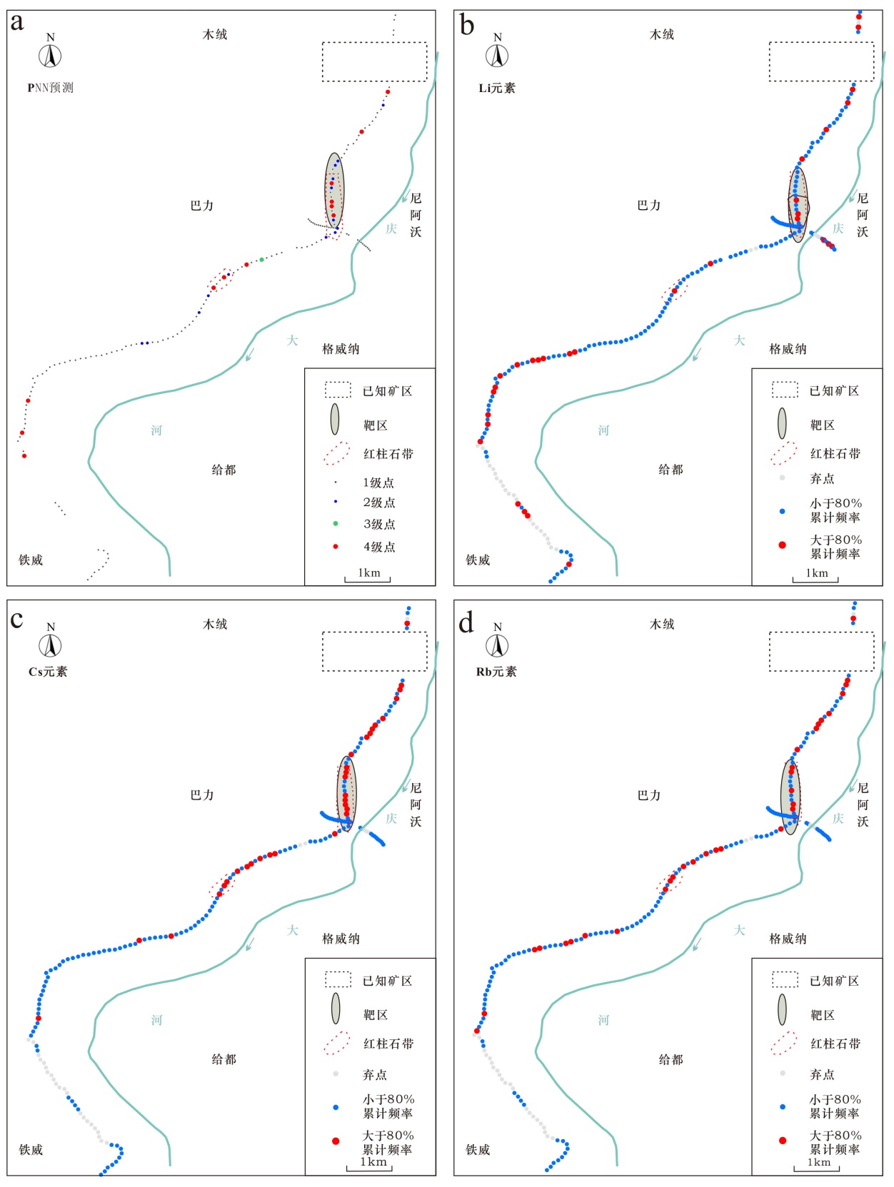 图2. PNN模型预测的找矿靶区与Li、Cs和Rb元素验证图[15]